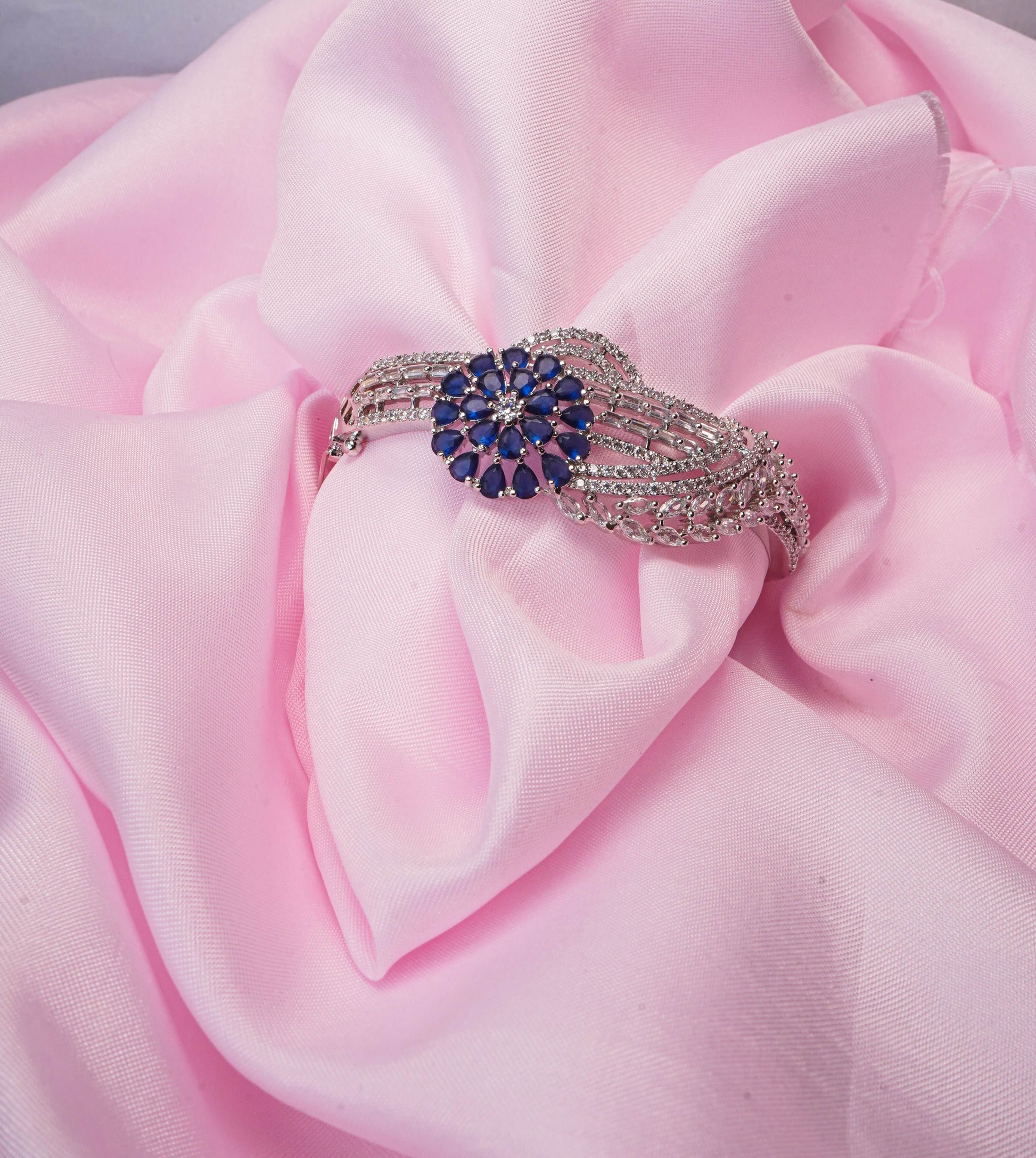 A statement bracelet that shines with regal charm — this piece features a radiant floral cluster of blue stones at its center, surrounded by sparkling AD lines in a graceful, layered design. The golden base enhances the brilliance of the stones, making it a perfect blend of traditional opulence and modern finesse.