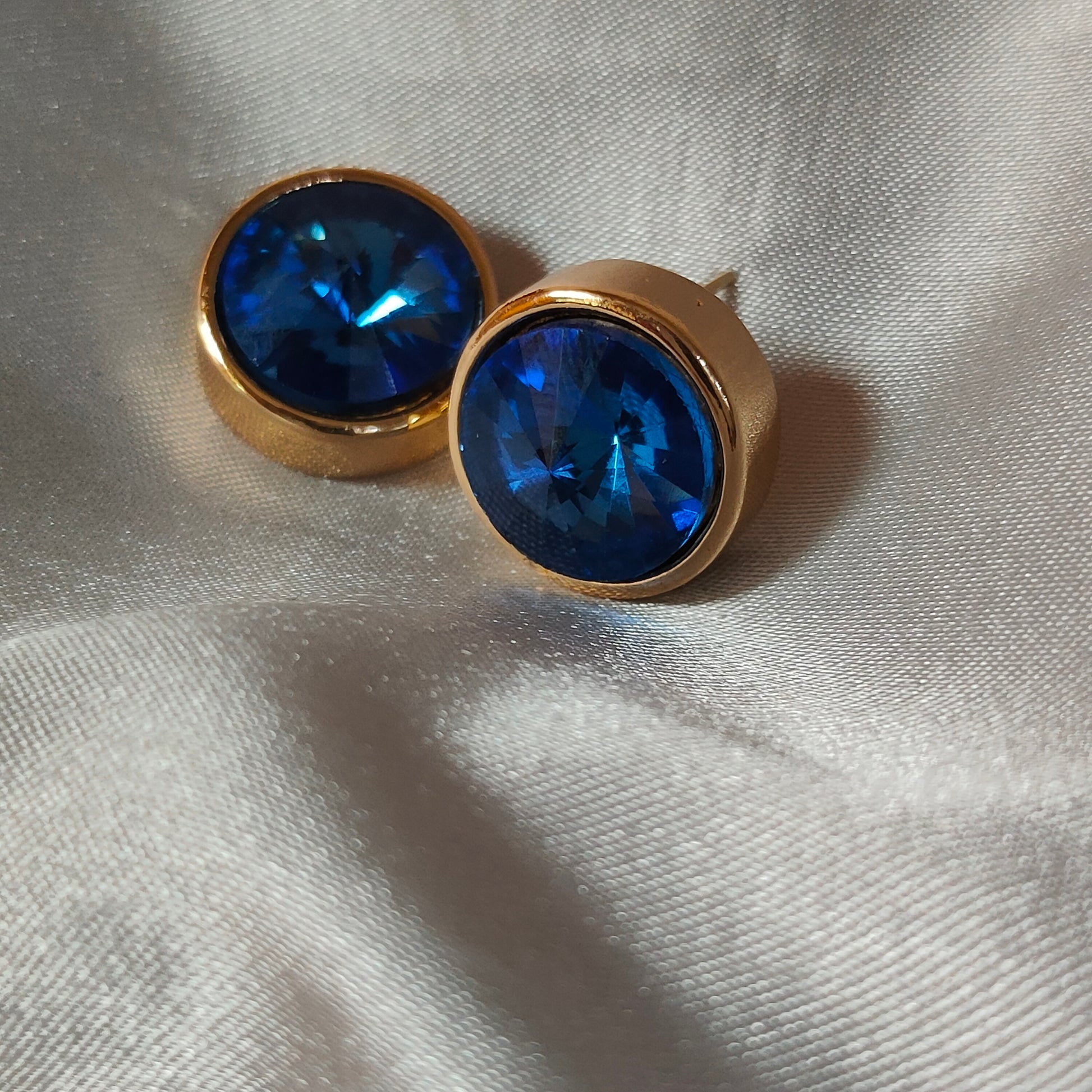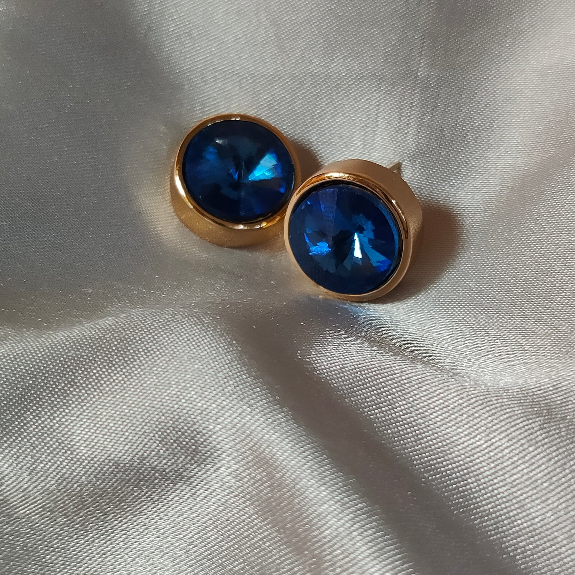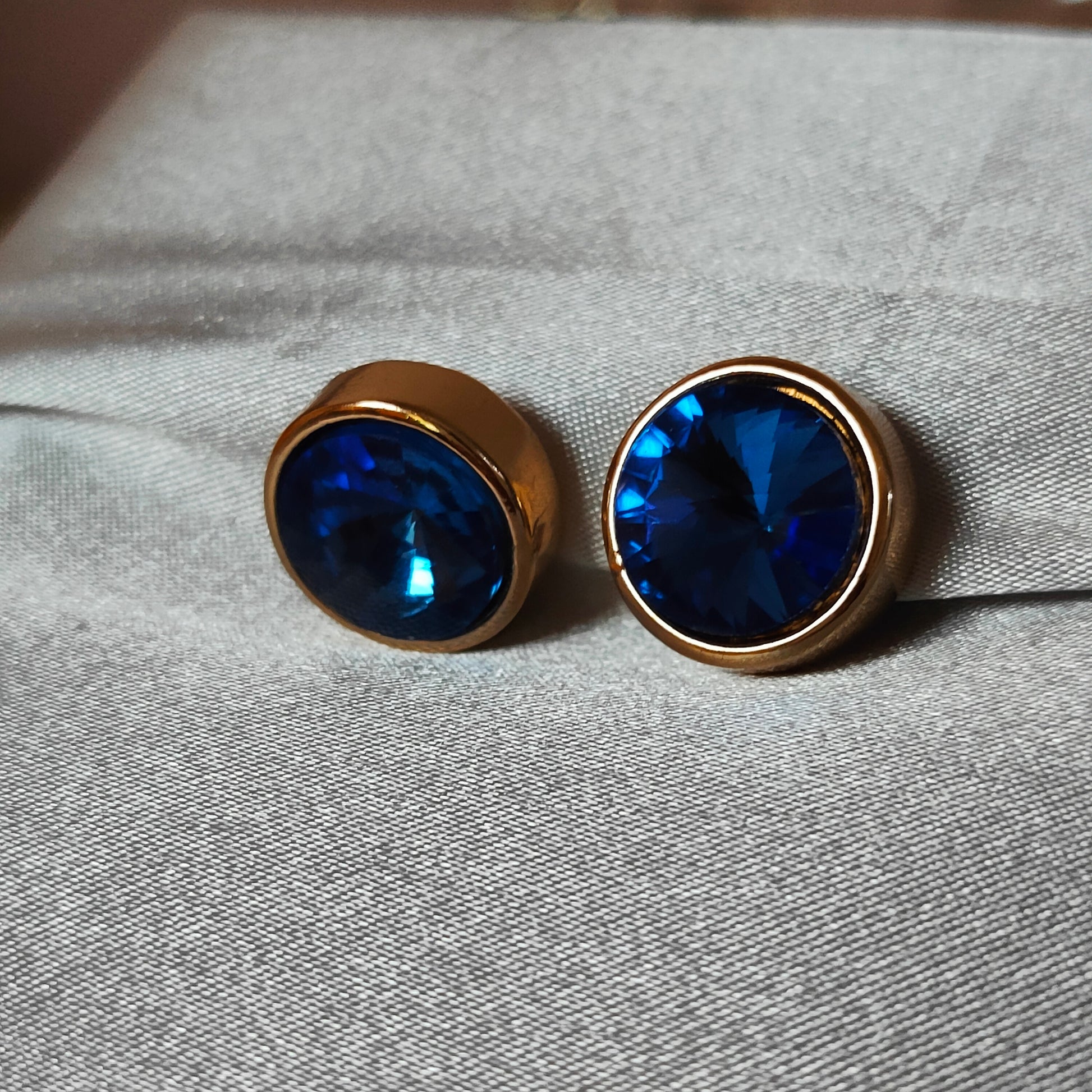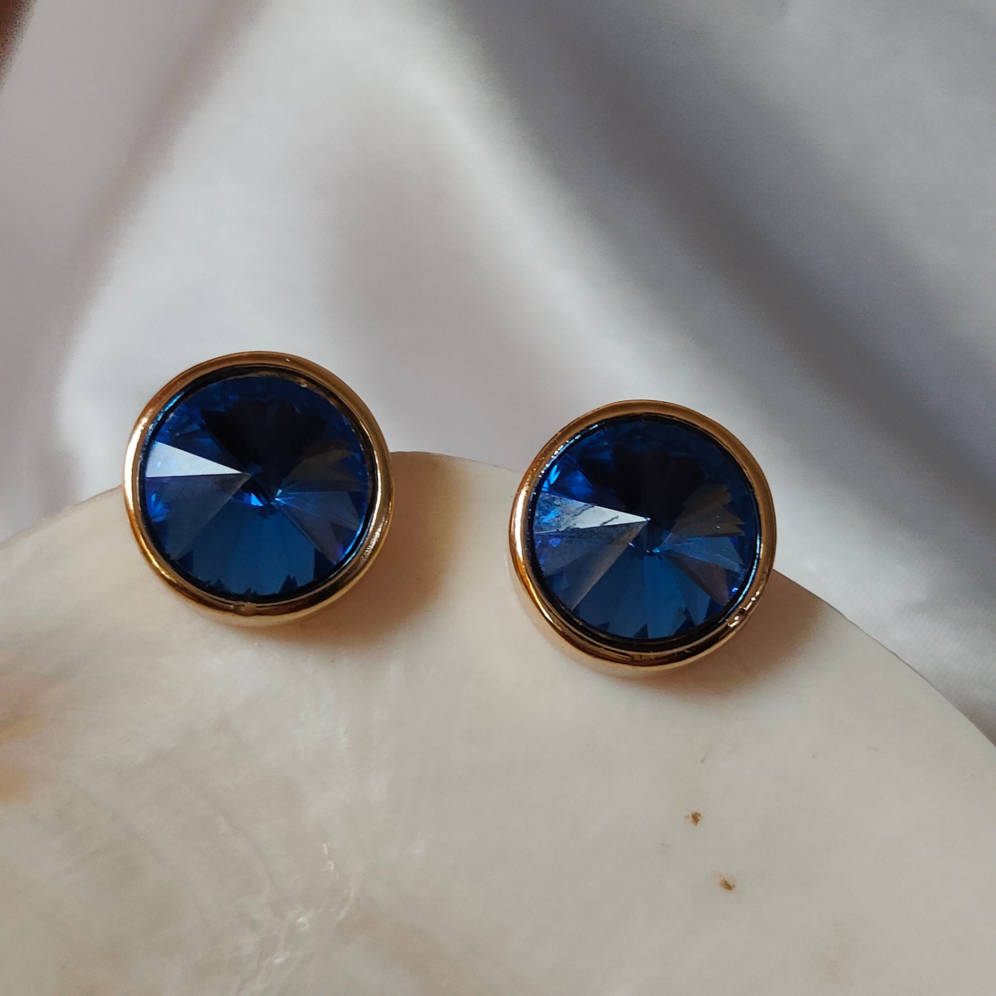 Add a pop of cosmic charm to your collection with Blue Mirage—a pair of dazzling round-cut blue crystal earrings encased in a warm gold bezel setting. The radiant cut reflects light beautifully, creating a hypnotic sparkle that’s both bold and elegant. Perfect for both daytime dazzle and evening glamour, these studs are a timeless blend of sophistication and allure.