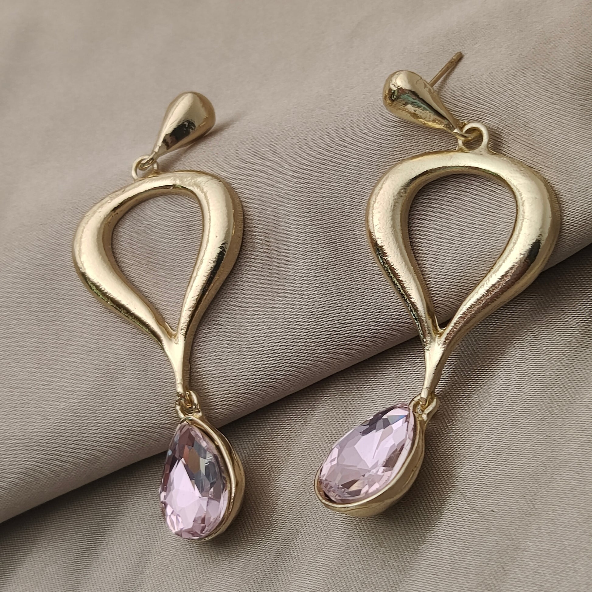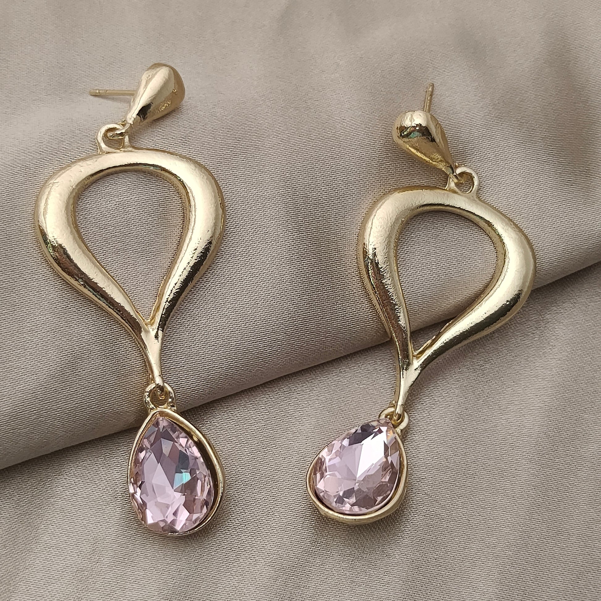 Delicate yet dramatic, the Blush Aura Drops are a perfect blend of modern design and romantic charm. Featuring a fluid, sculptural gold silhouette with a dangling blush-pink teardrop crystal, these earrings are made for moments where you want to shine — softly but unmistakably.