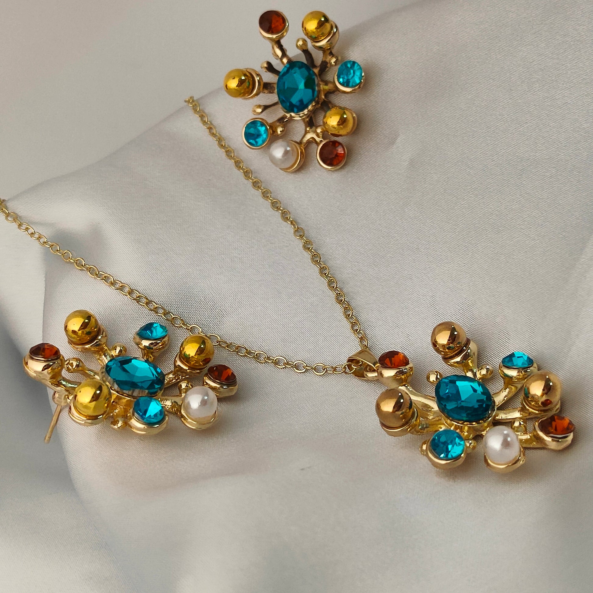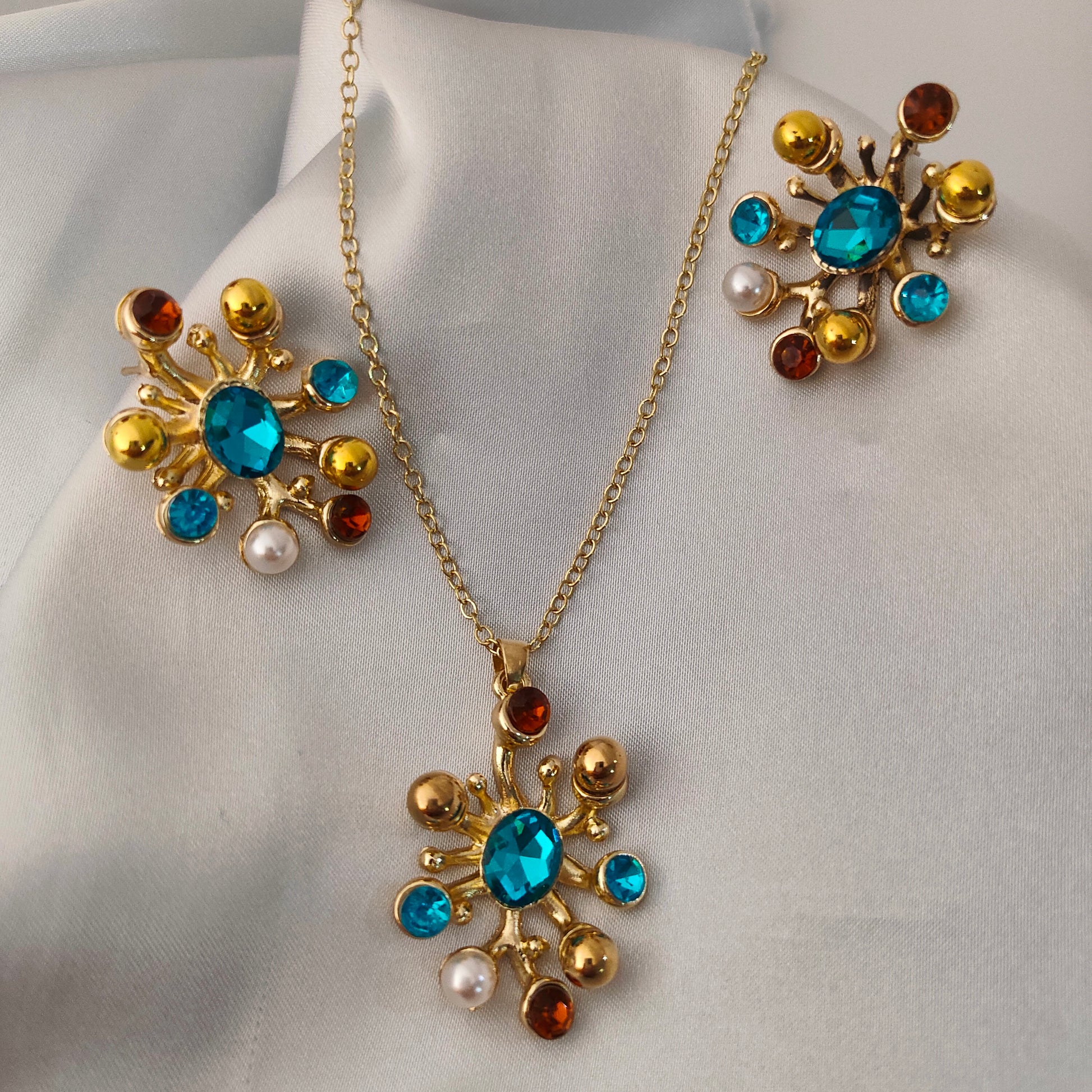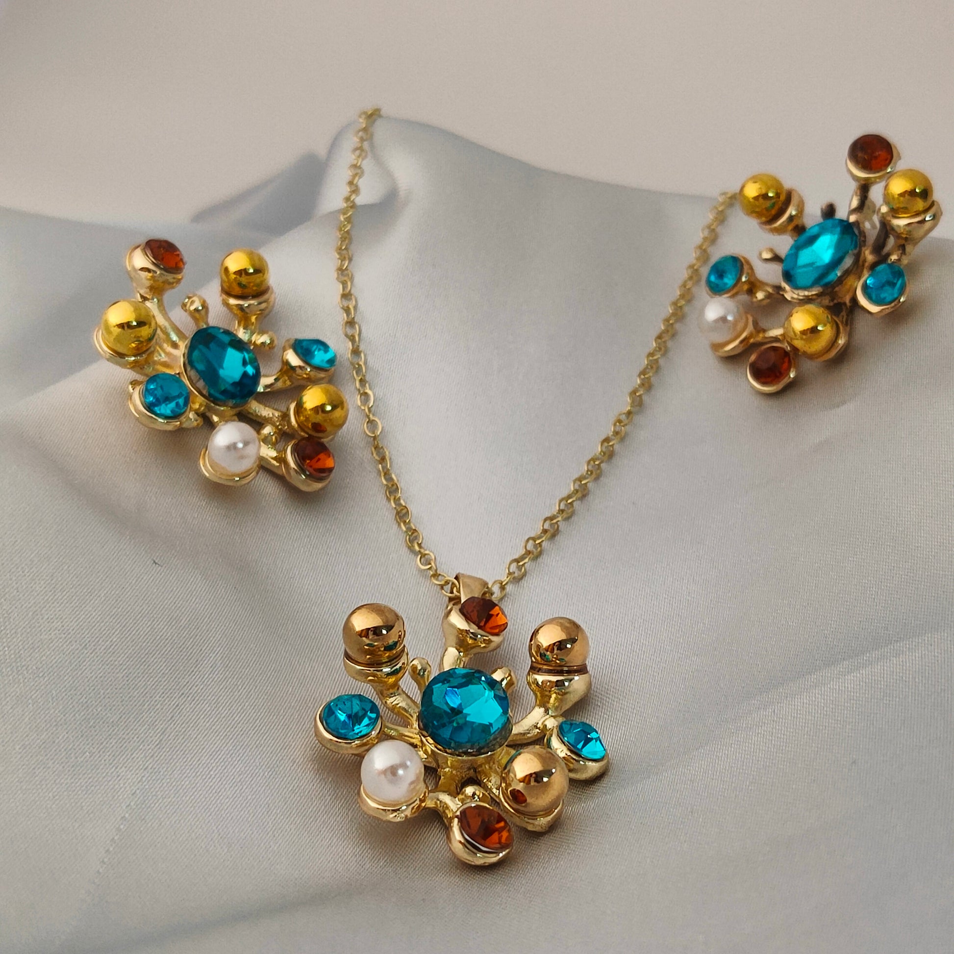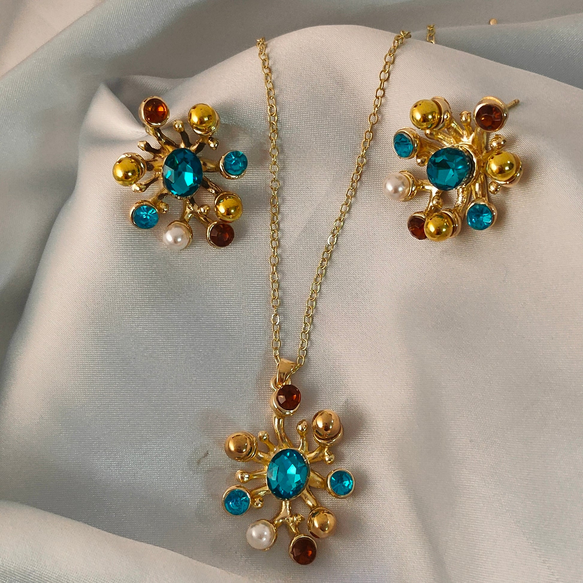 Unleash your bold spirit with the Celestial Bloom Set. This eye-catching set features a radiant pendant and matching earrings adorned with a vivid arrangement of teal blue stones, golden beads, amber-toned accents, and a classic pearl โ all set in a starburst floral design. Perfect for those who love colorful, artistic jewelry that stands out effortlessly.
