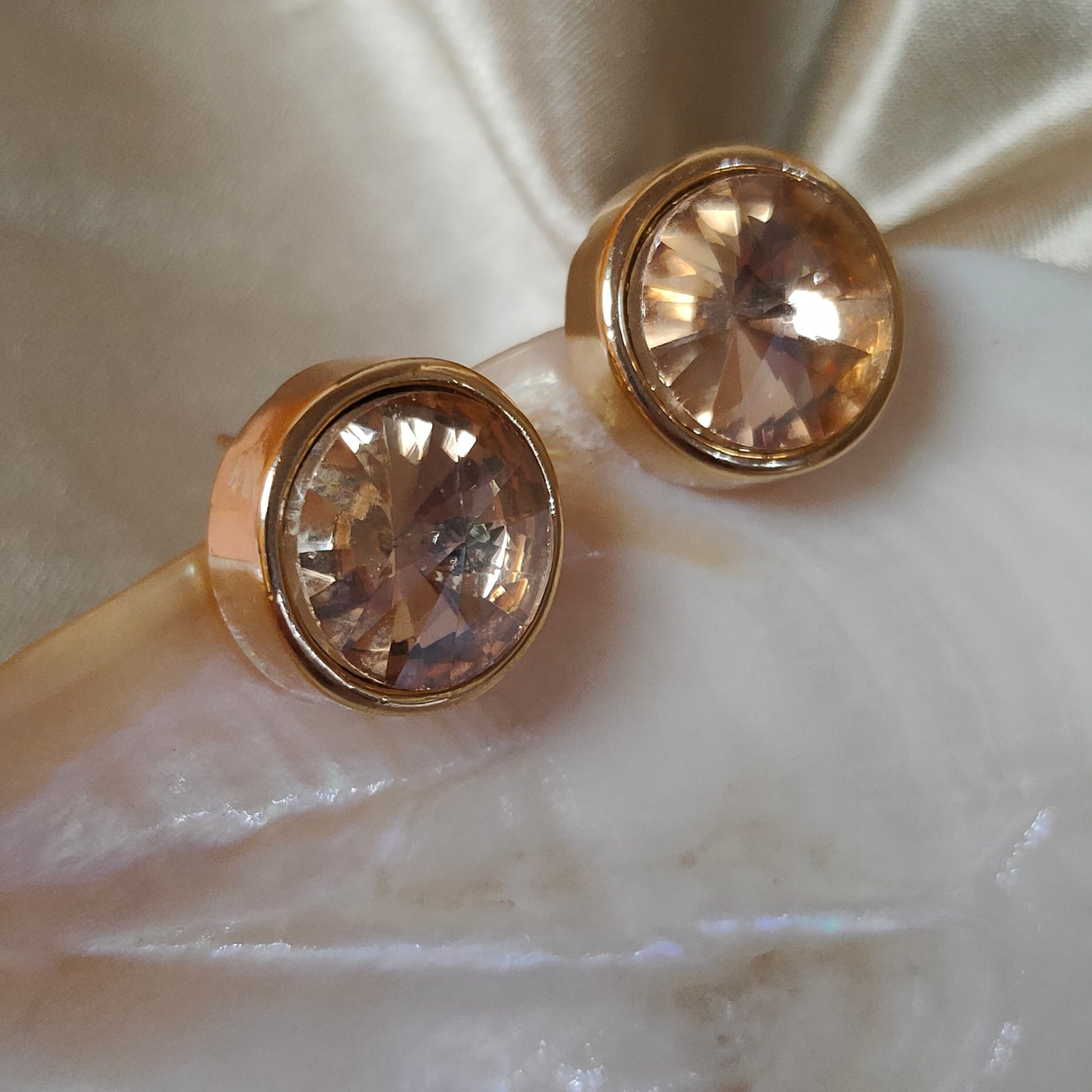 Graceful and luminous, Champagne Dusk features a pair of round-cut crystals in a soft champagne hue, embraced by a sleek golden bezel. Their delicate shimmer evokes the golden hour’s warmth, making them the perfect blend of elegance and versatility. Whether worn for a celebration or a casual evening, these earrings add a subtle glow to your look.