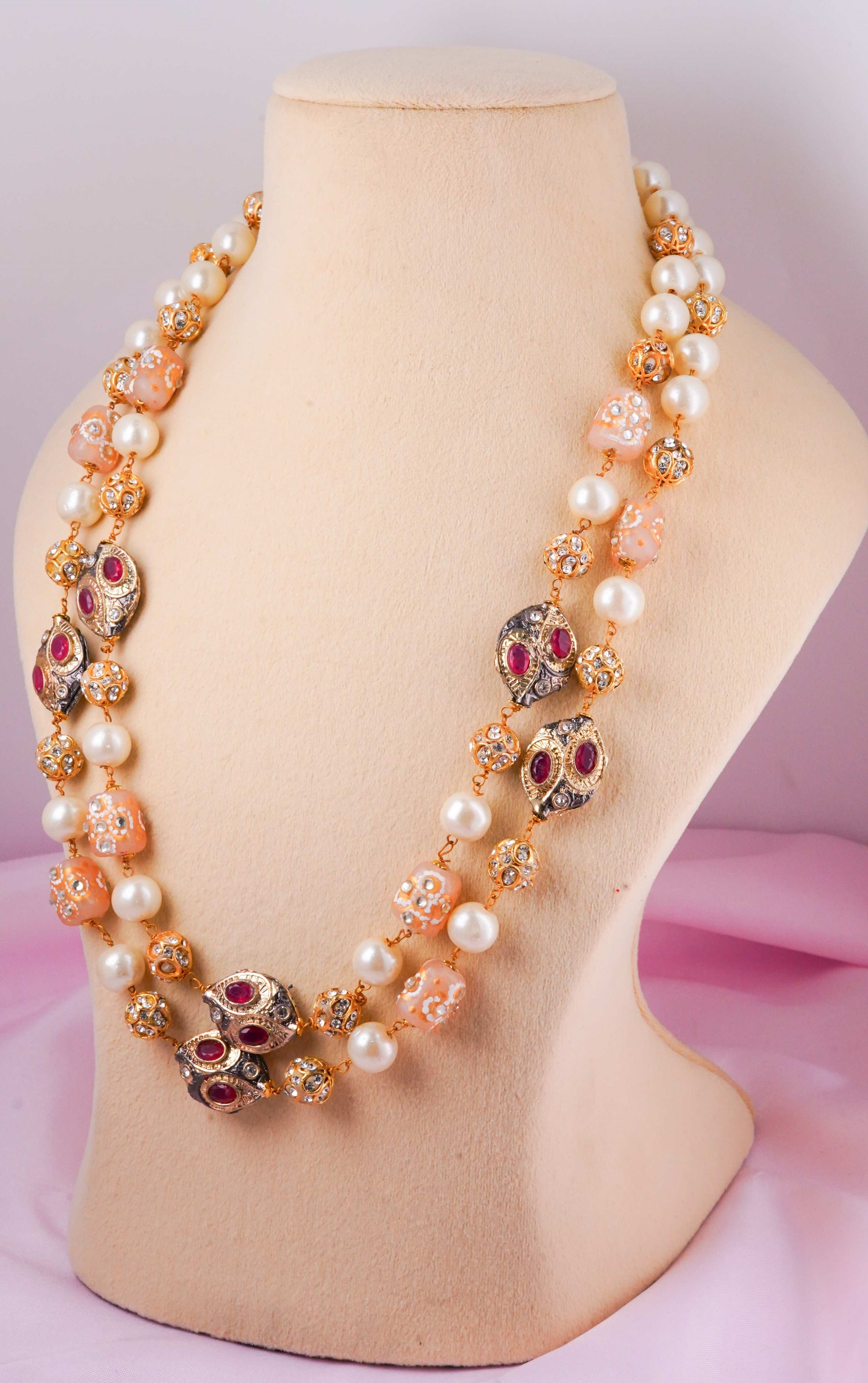 A beautifully handcrafted mala featuring soft peach carved beads, lustrous pearls, kundan-studded spacers and antique ruby-toned oval charms. Its blend of pastel elegance and heritage detailing creates a rich yet feminine look—perfect for wedding functions, festive poojas, and elevated ethnic outfits.