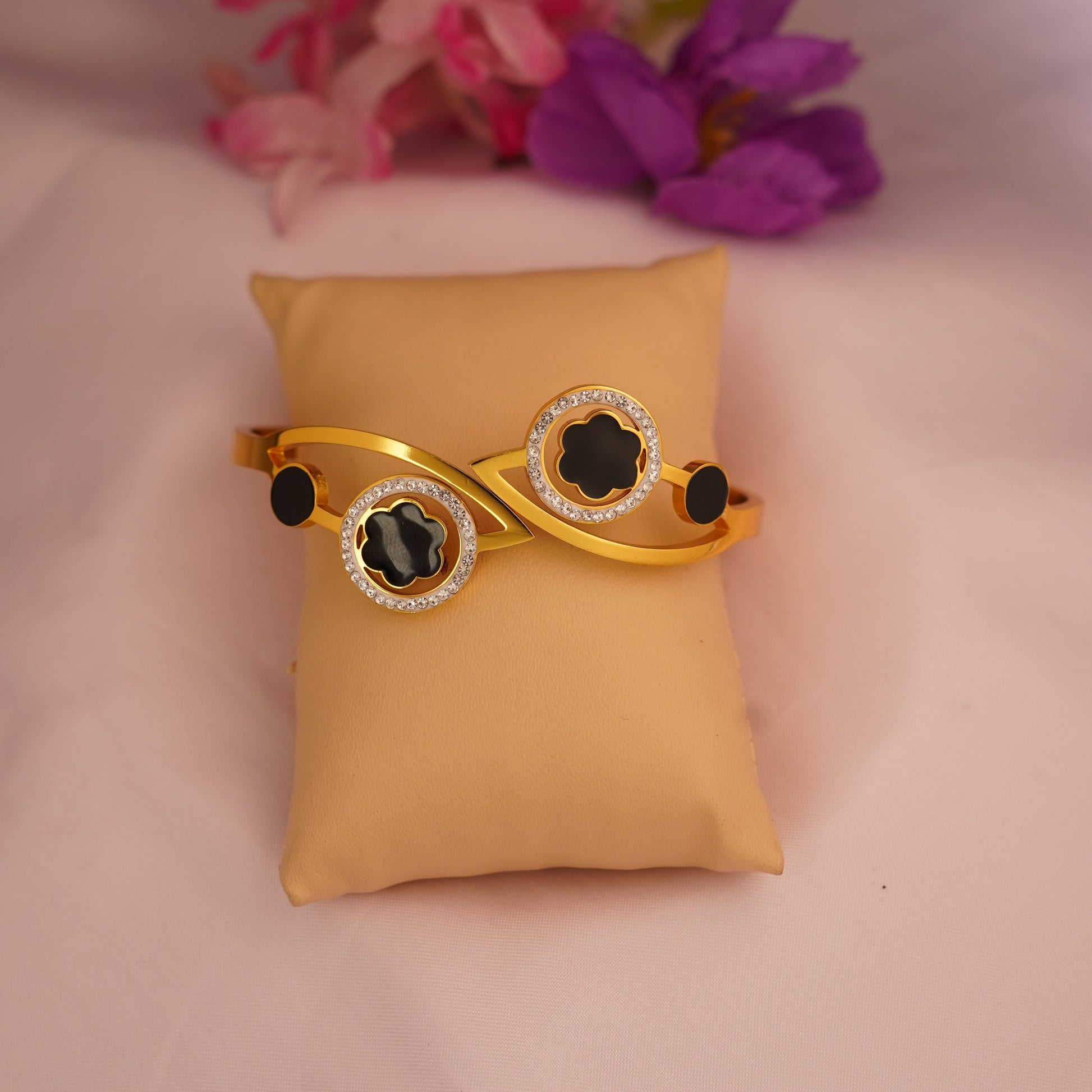 Add a touch of sophistication with this gold-plated bracelet featuring a chic black clover design surrounded by shimmering stones – perfect for both casual and festive looks.