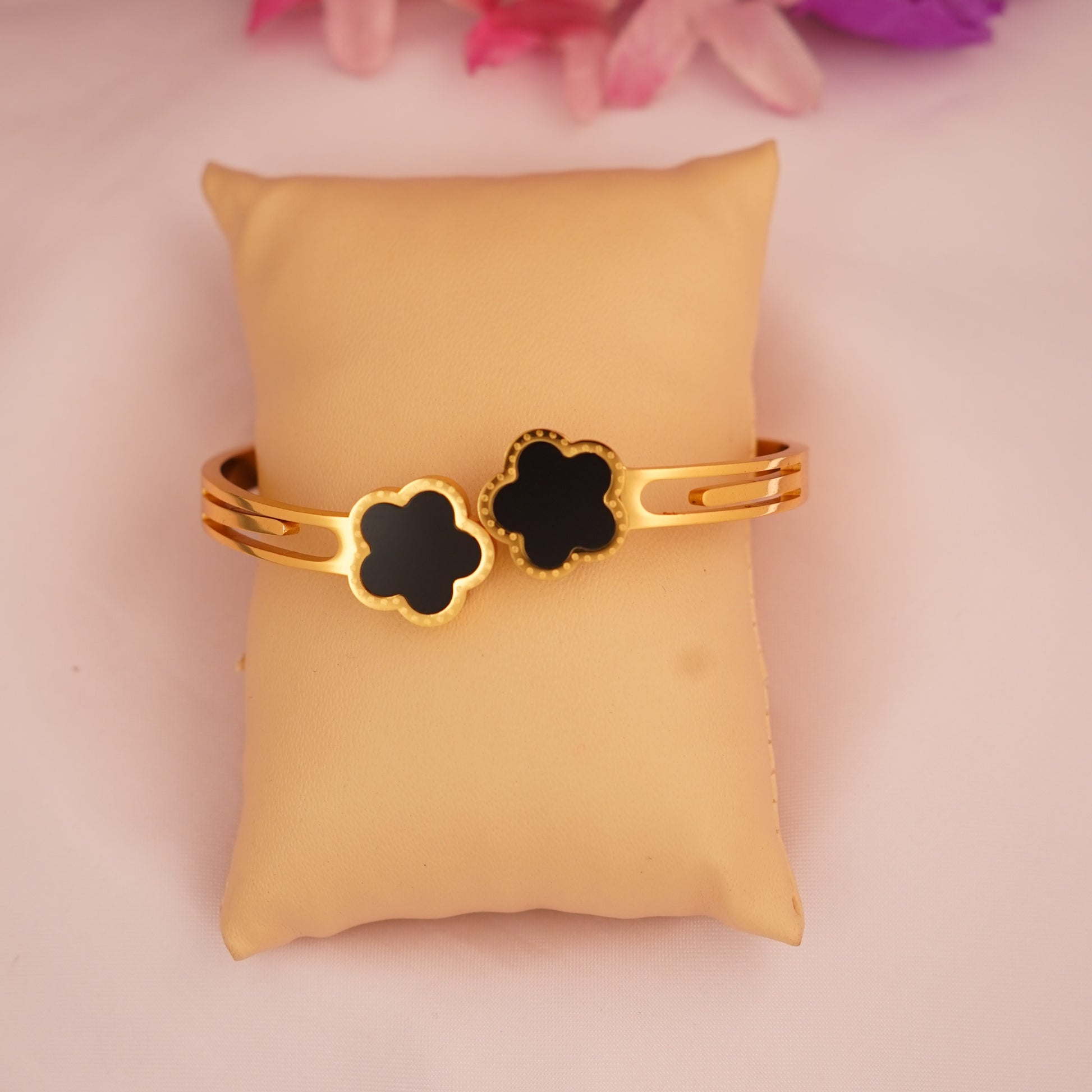 Add timeless beauty to your style with this stunning anti-tarnish bracelet featuring dual black clover motifs in a gold finish. Perfect for everyday wear or special occasions, this bracelet combines sophistication with durability.