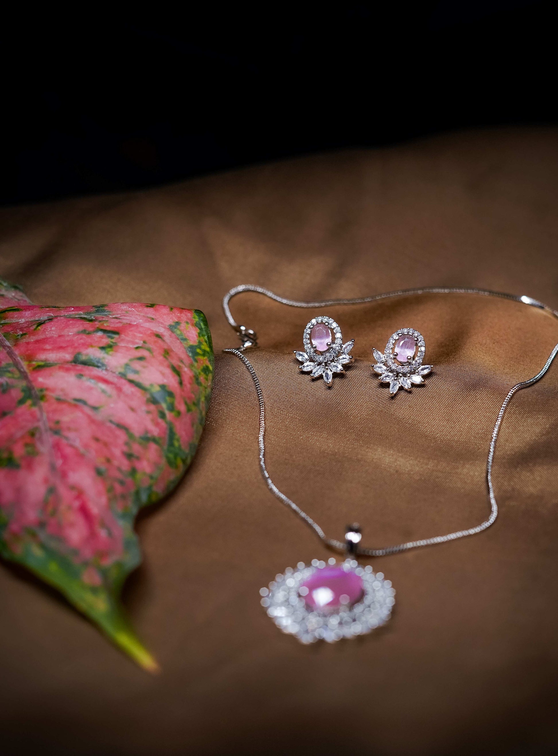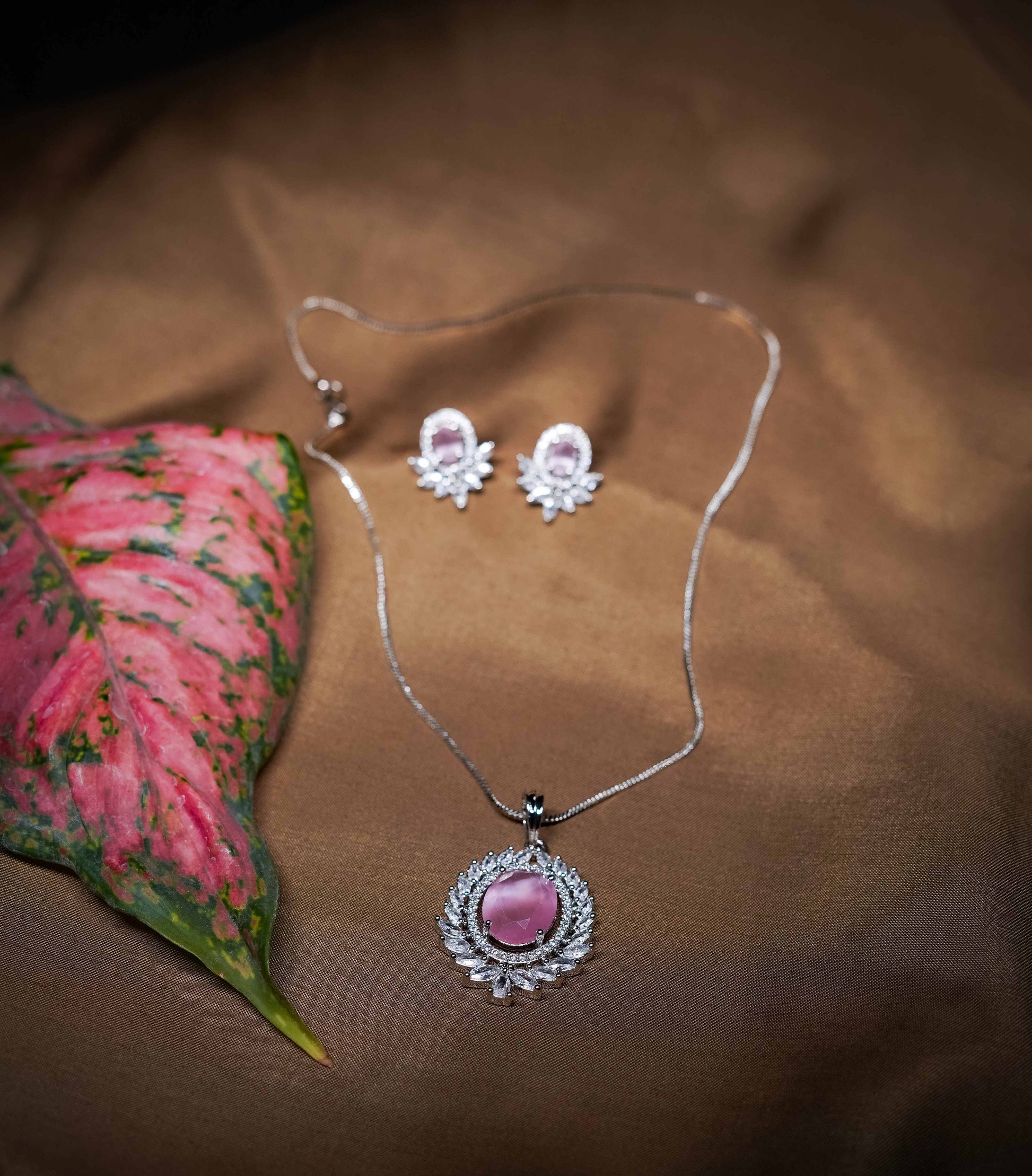 A striking pendant set featuring a Cherry blossom pink stone at its heart, framed with delicate silver-toned floral petals. The contrast of lush green and shimmering silver creates a look that is both regal and graceful, making it the perfect choice for women who love jewellery that blends freshness with elegance.