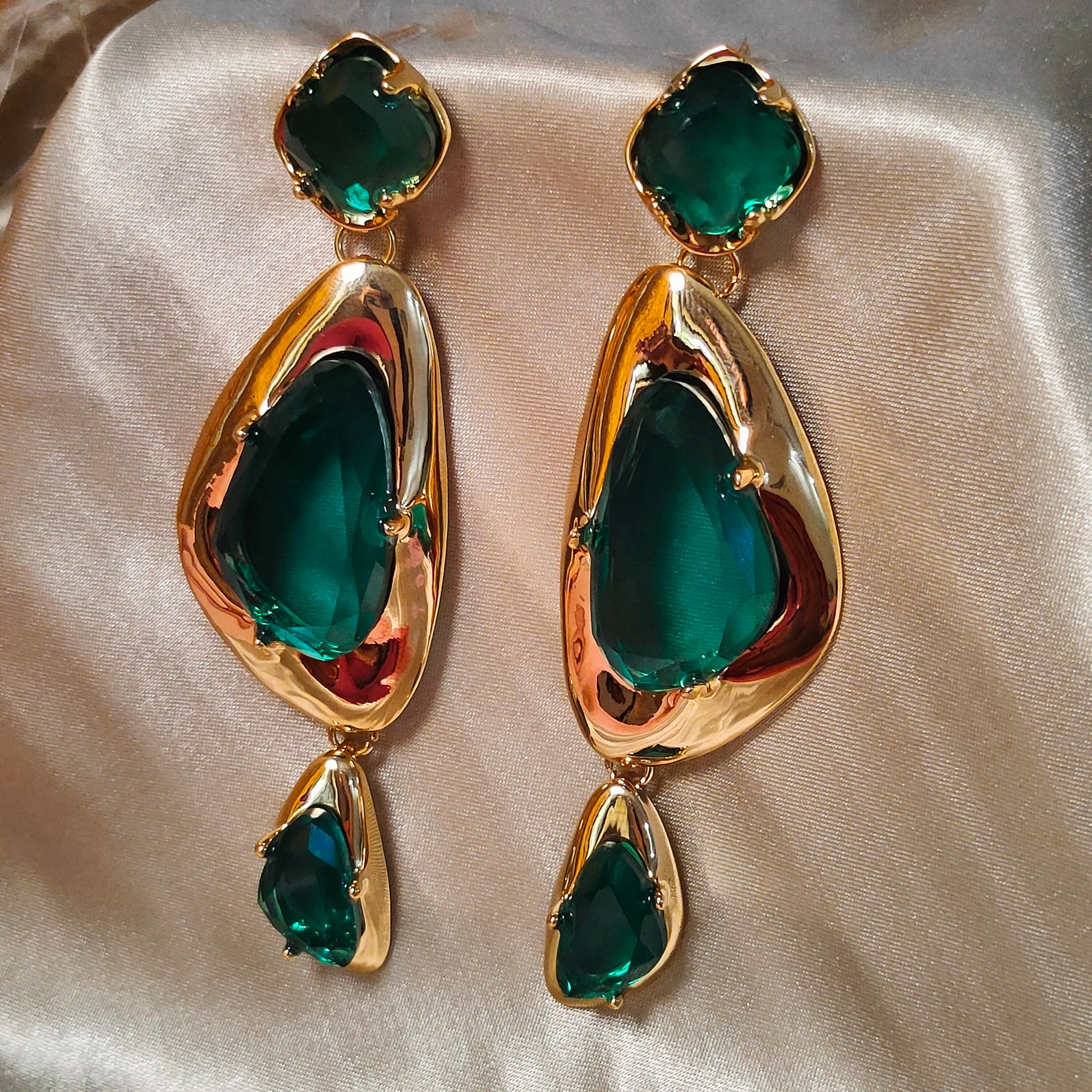 Turn heads with the Emerald Gaze earrings—an elegant fusion of deep emerald-green stones and sculptural gold-toned frames. These statement drops feature three glistening faceted stones, each embraced in a high-polish golden setting. Their bold, artistic silhouette gives the illusion of fine jewelry, while remaining lightweight enough for extended wear. Perfect for elevating any outfit with a pop of luxurious color and shine.