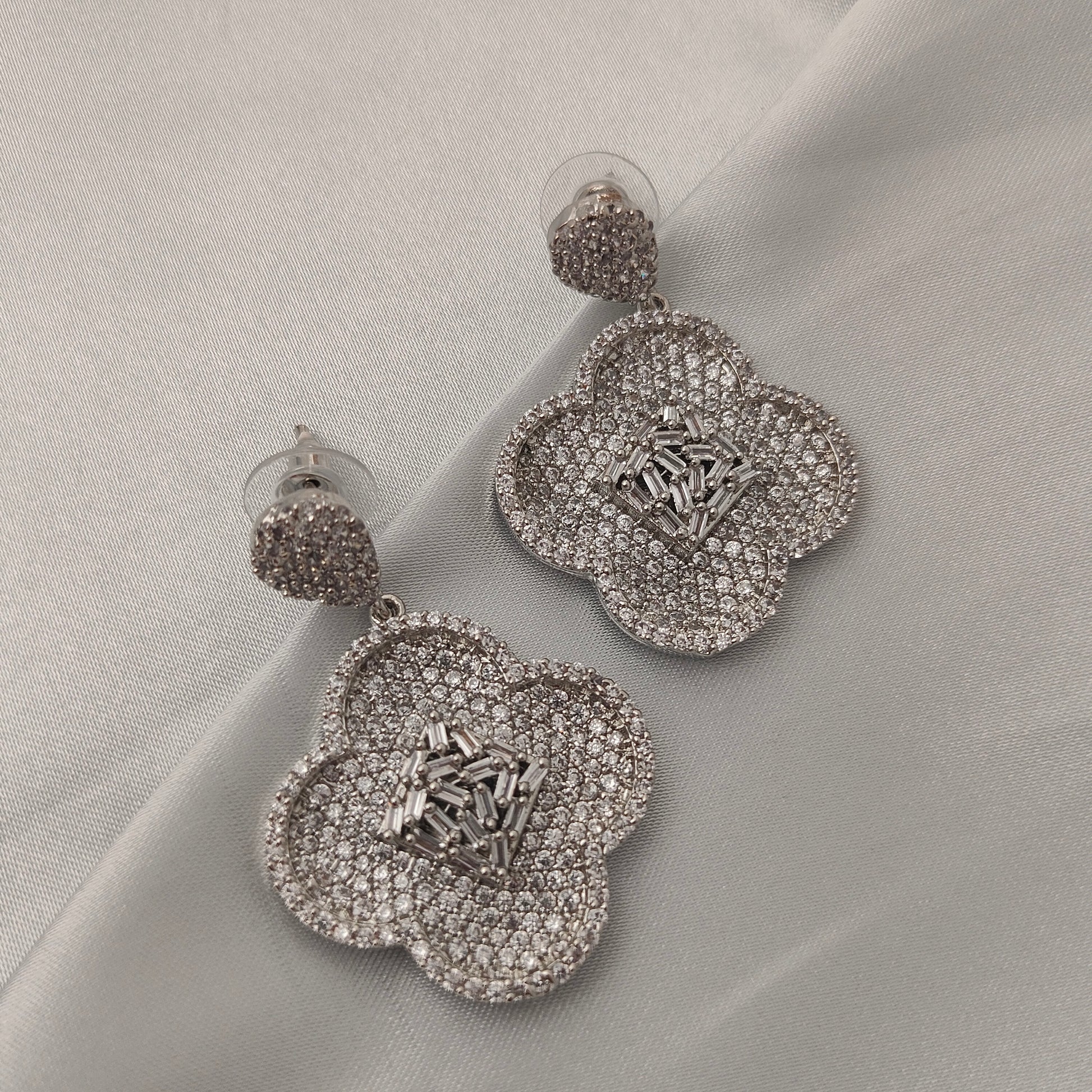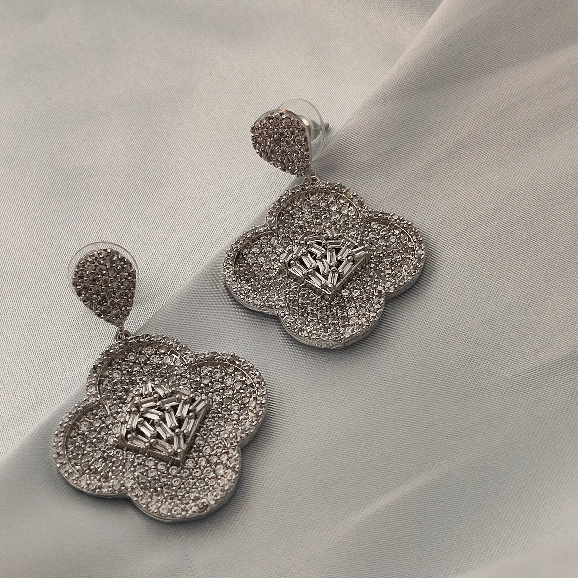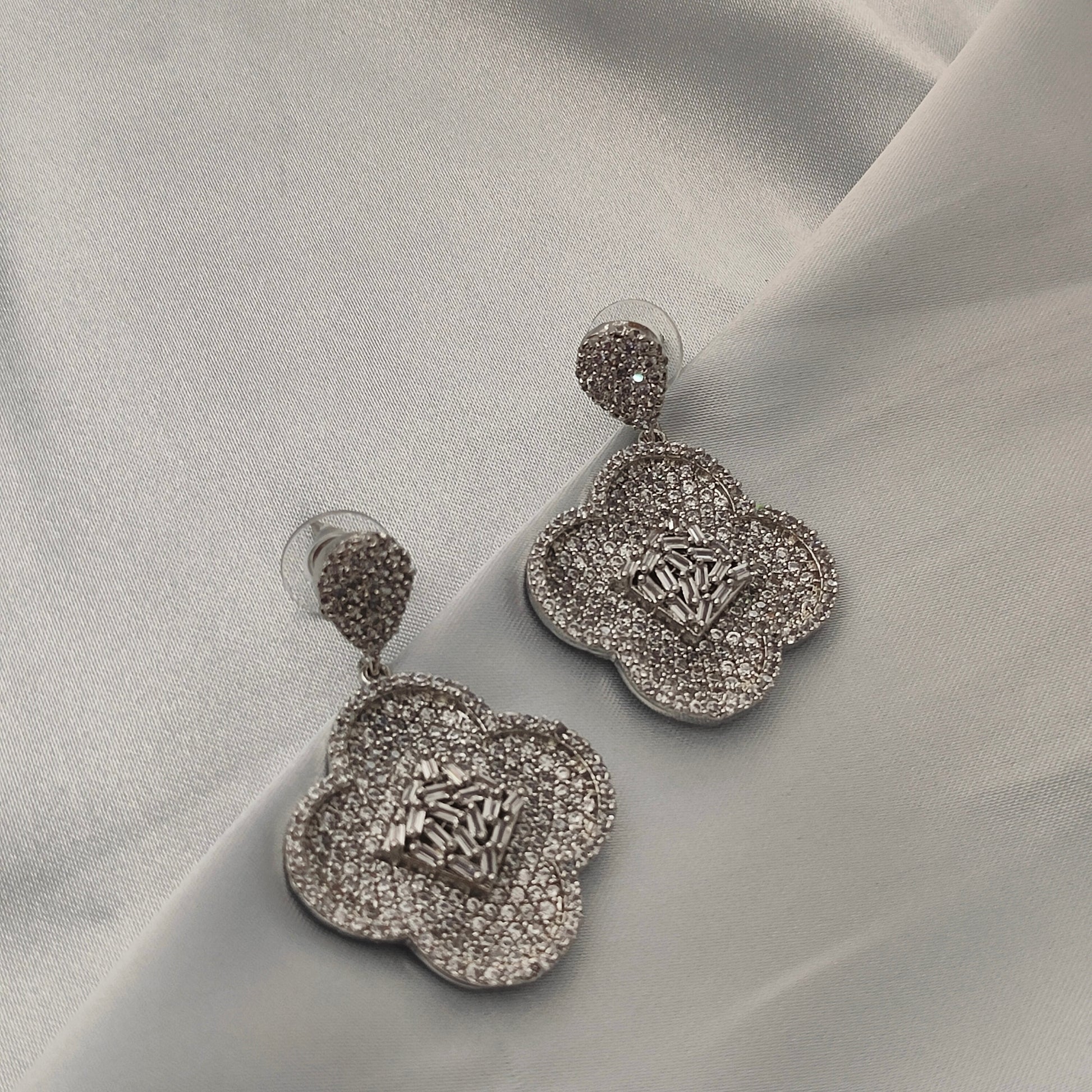 Channel luxury and elegance with our Frozen Bloom Drops – a floral fantasy cast in shimmering stones. These sparkling silver-toned earrings feature a four-petal design fully encrusted with fine crystals and baguette-cut stones in the center, making them the perfect statement piece for glamorous evenings or festive celebrations.