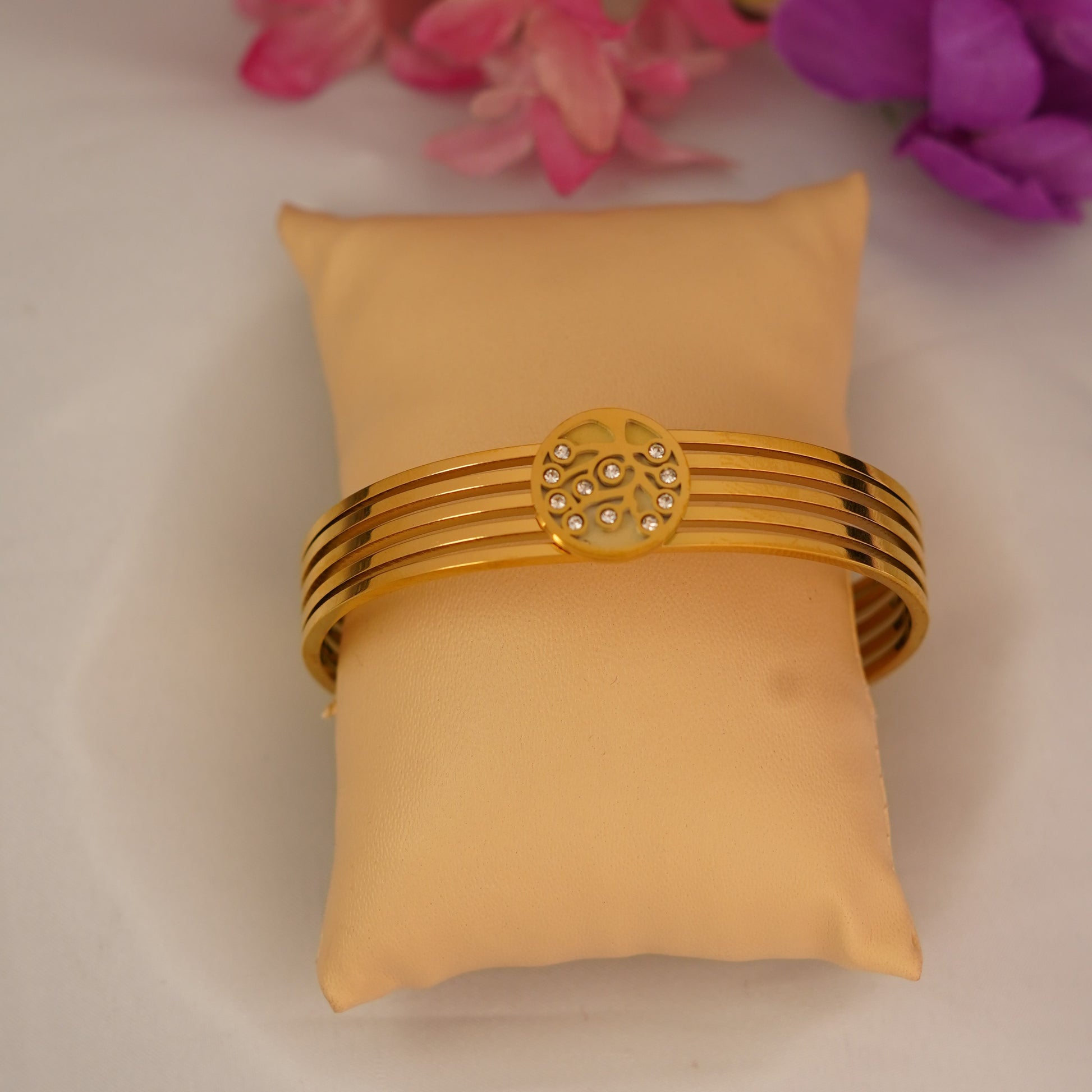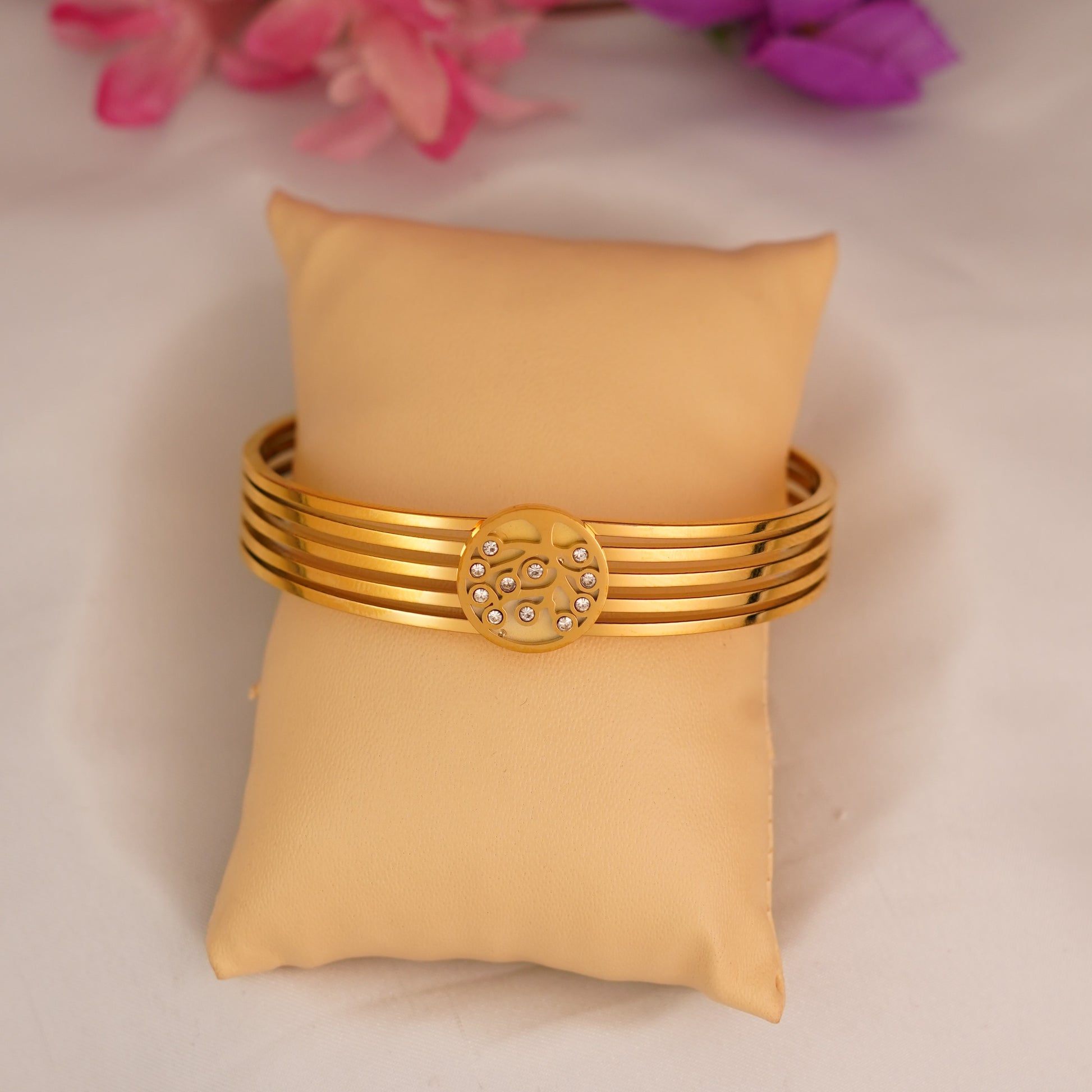 Introducing our Galaxy Disc Bracelet, a sleek and modern piece crafted with a stunning circular centre adorned with tiny shimmering stones. The elegant kada-style lines on the sides give it a structured, classy silhouette, making it the perfect blend of minimal and festive. Delicate yet eye-catching, this bracelet adds effortless sophistication to any look.