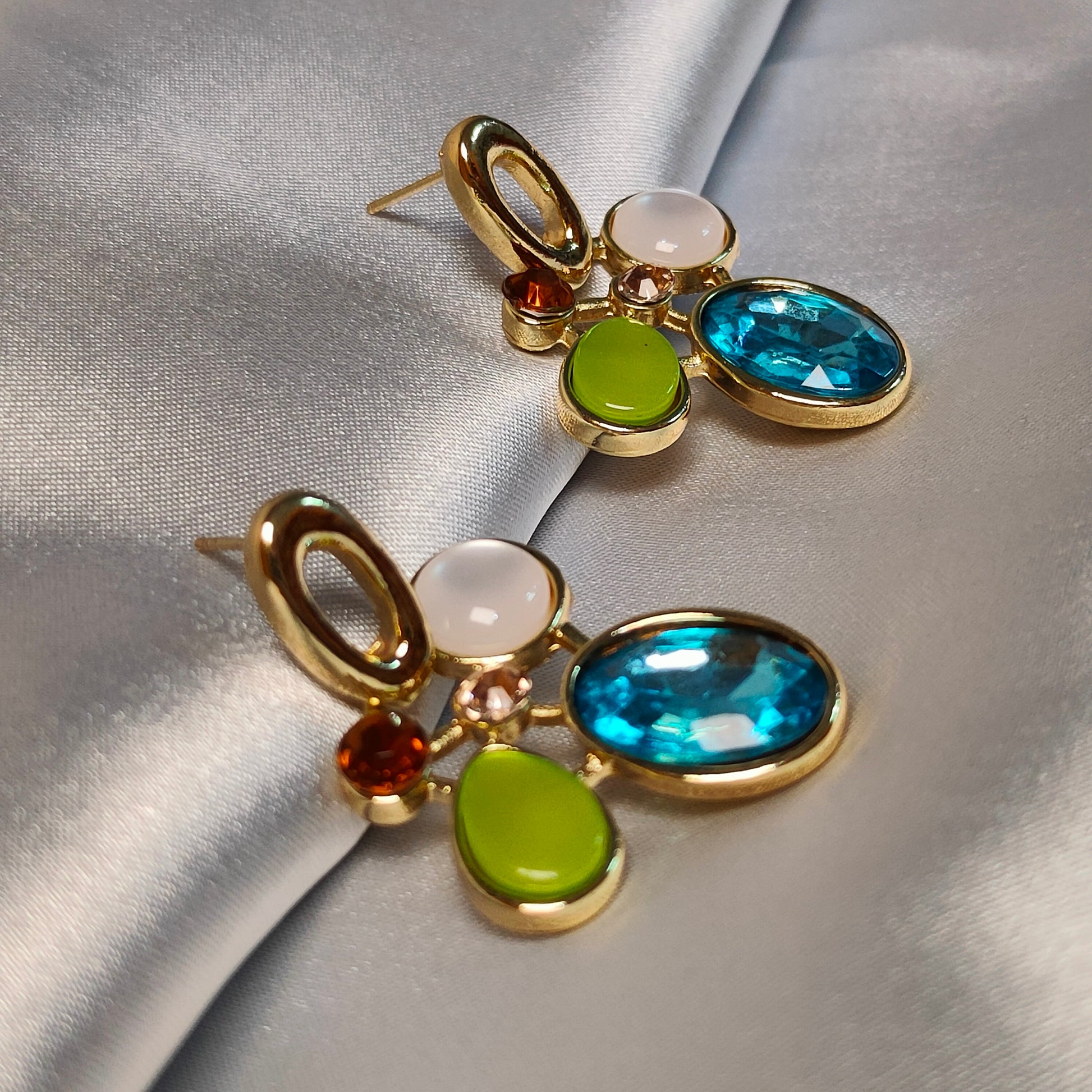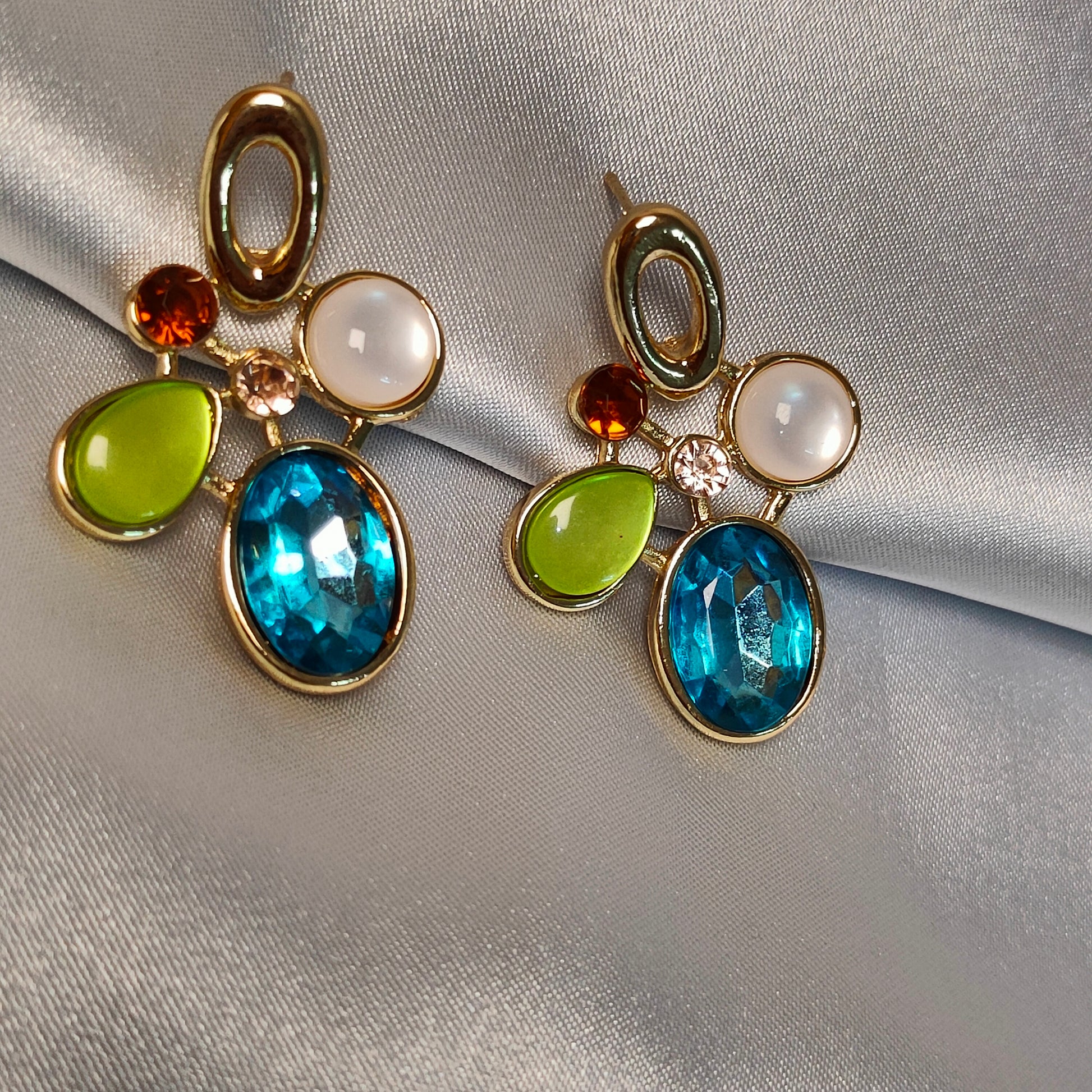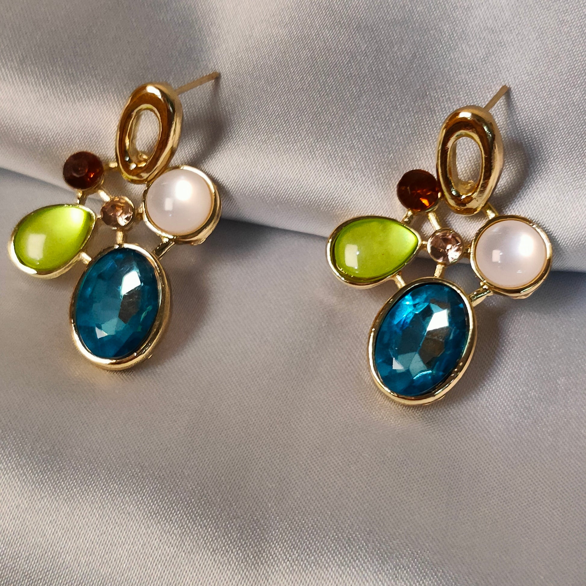Bursting with color and character, the Gem Pop earrings are a playful mix of bold blue, lime green, pearl white, amber, and crystal-clear stones, all set in a refined gold-tone frame. Their asymmetrical layout and gem-cluster design give off an artistic, modern vibe—perfect for statement makers who love a splash of color with a polished twist.