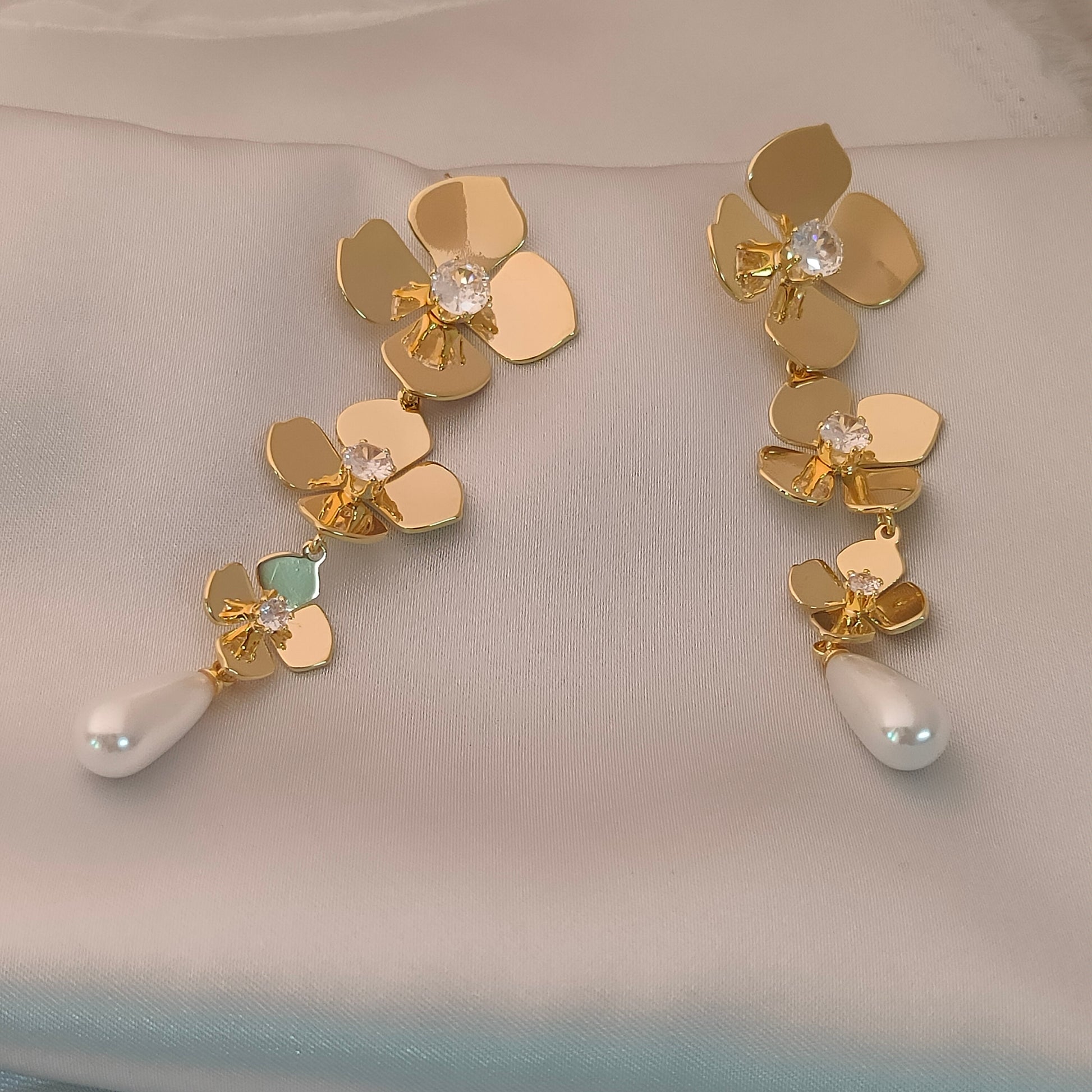 Ethereal and elegant, the Golden Bloom Drops feature cascading metallic flowers with glistening crystal centers and a delicate pearl teardrop finish. Their refined design evokes the beauty of spring blossoms, making them a dreamy addition to both modern and romantic looks.