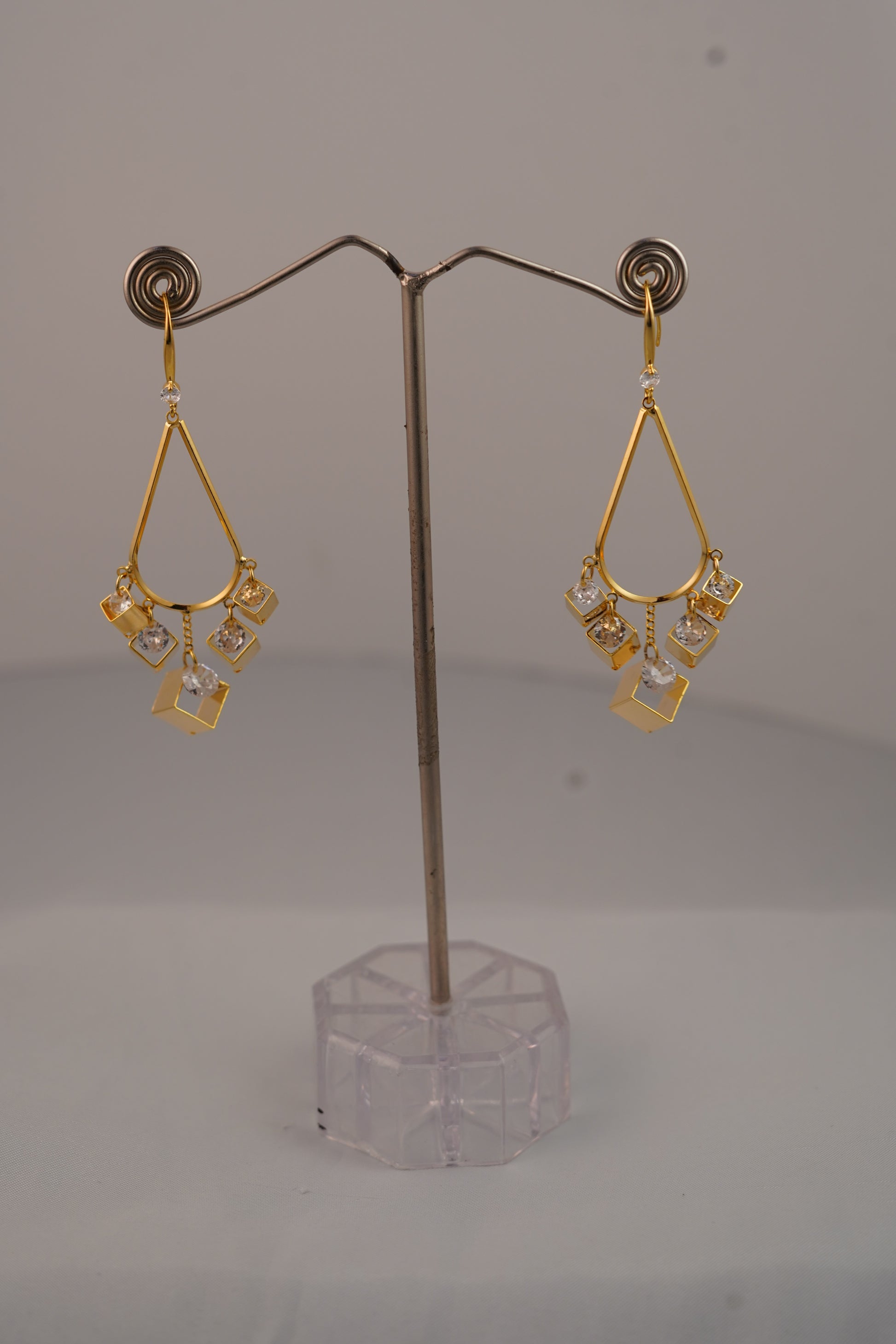 Edgy meets elegance with the Golden Geomé Dangle, designed for the modern muse. These teardrop-shaped earrings feature a cascade of miniature geometric charms — squares, cubes, and open frames — in polished gold tones accented by crystal-clear stones and a hint of blush pink. Perfectly balanced, they move with grace and catch the light from every angle.