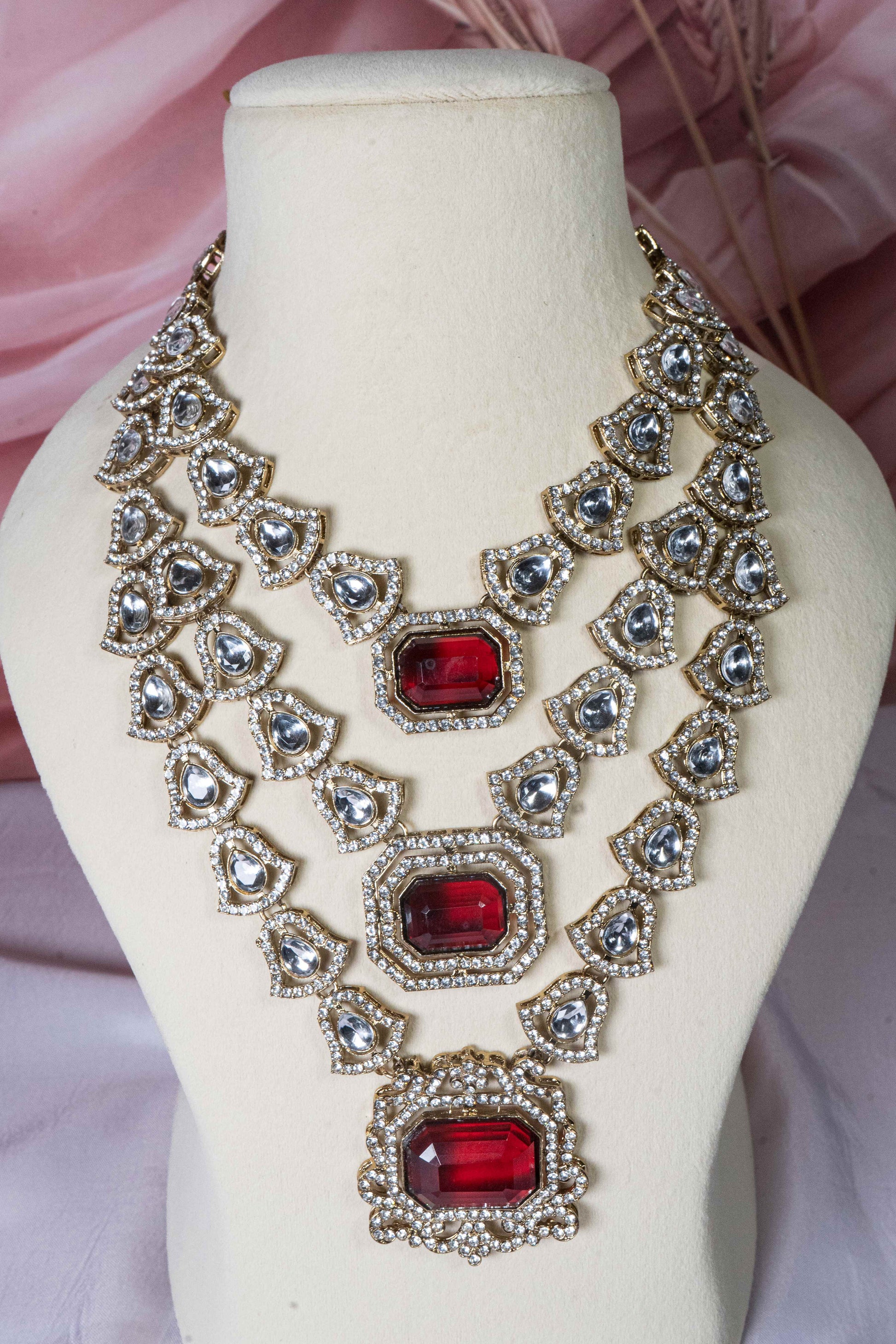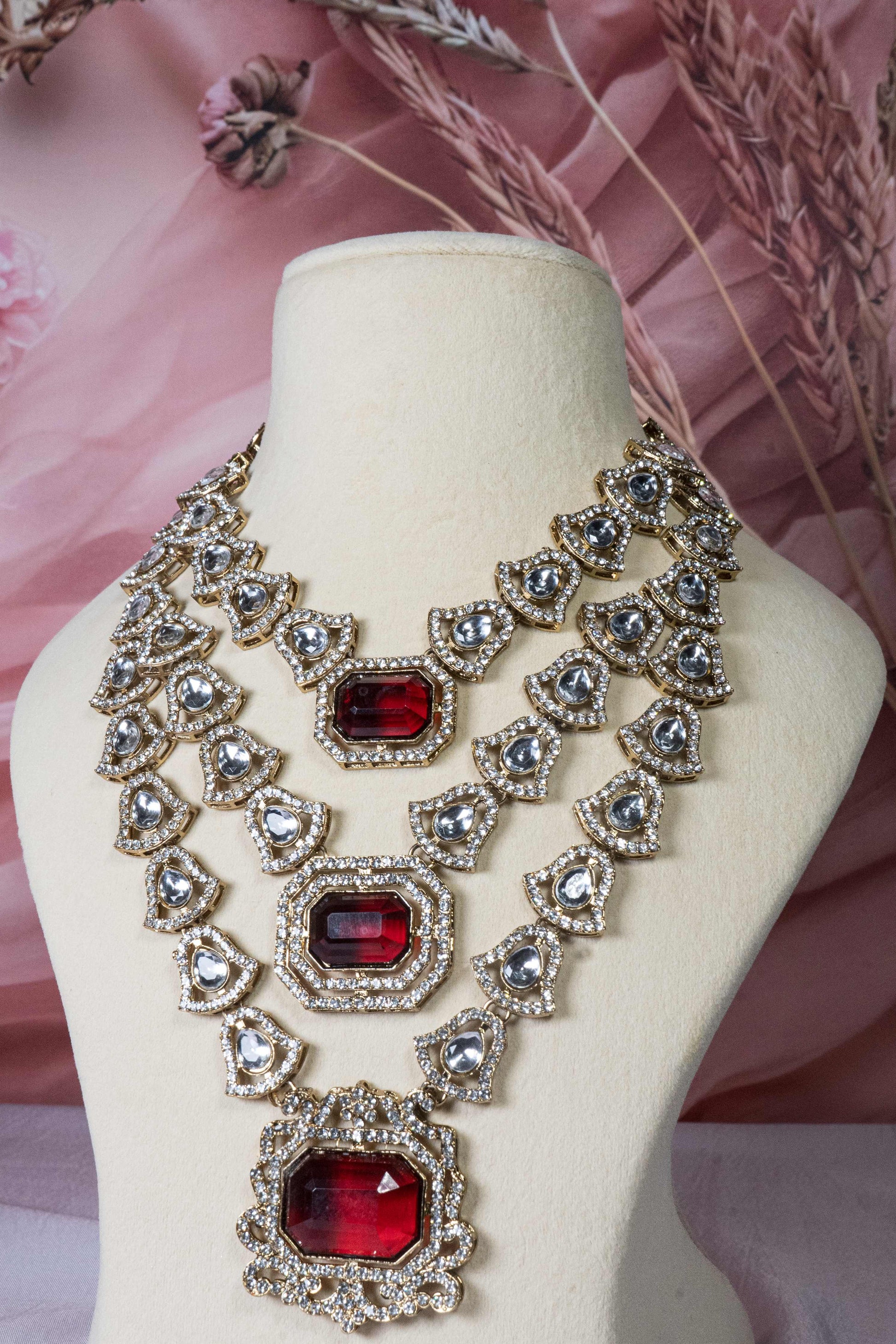 The Hexa Triple Layer Necklace Set exudes timeless elegance with its delicately crafted layers and soft red stones at the centre of each hexagon. The gentle hue adds a touch of feminine grace, while the triple-layer design gives a luxurious, regal appeal. Perfect for both modern and traditional looks, this piece beautifully balances subtlety and sophistication — making it a statement addition to your jewelry collection.