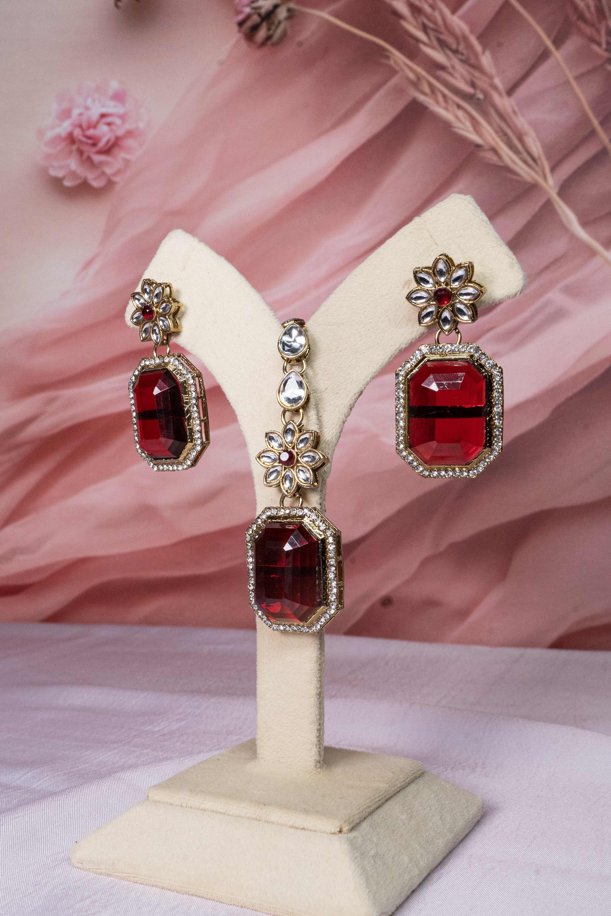 Add a touch of royal allure with our Red Hexatriline Necklace Set – featuring a bold hexagonal stone at the centre, surrounded by intricate gold-toned detailing. The deep red hue symbolizes passion and grace, making it a statement piece that instantly elevates your festive and wedding looks. ✨