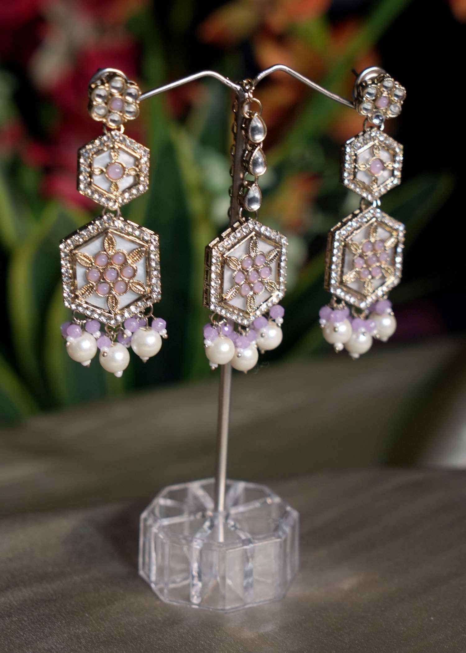 Delicate and enchanting, this lavender hexagon choker features a soft lavender hexagonal centerpiece, adorned with sparkling kundan work and subtle pearls for a graceful finish. Its modern geometric design combined with traditional detailing makes it perfect for weddings, festive occasions, and evening soirees.
