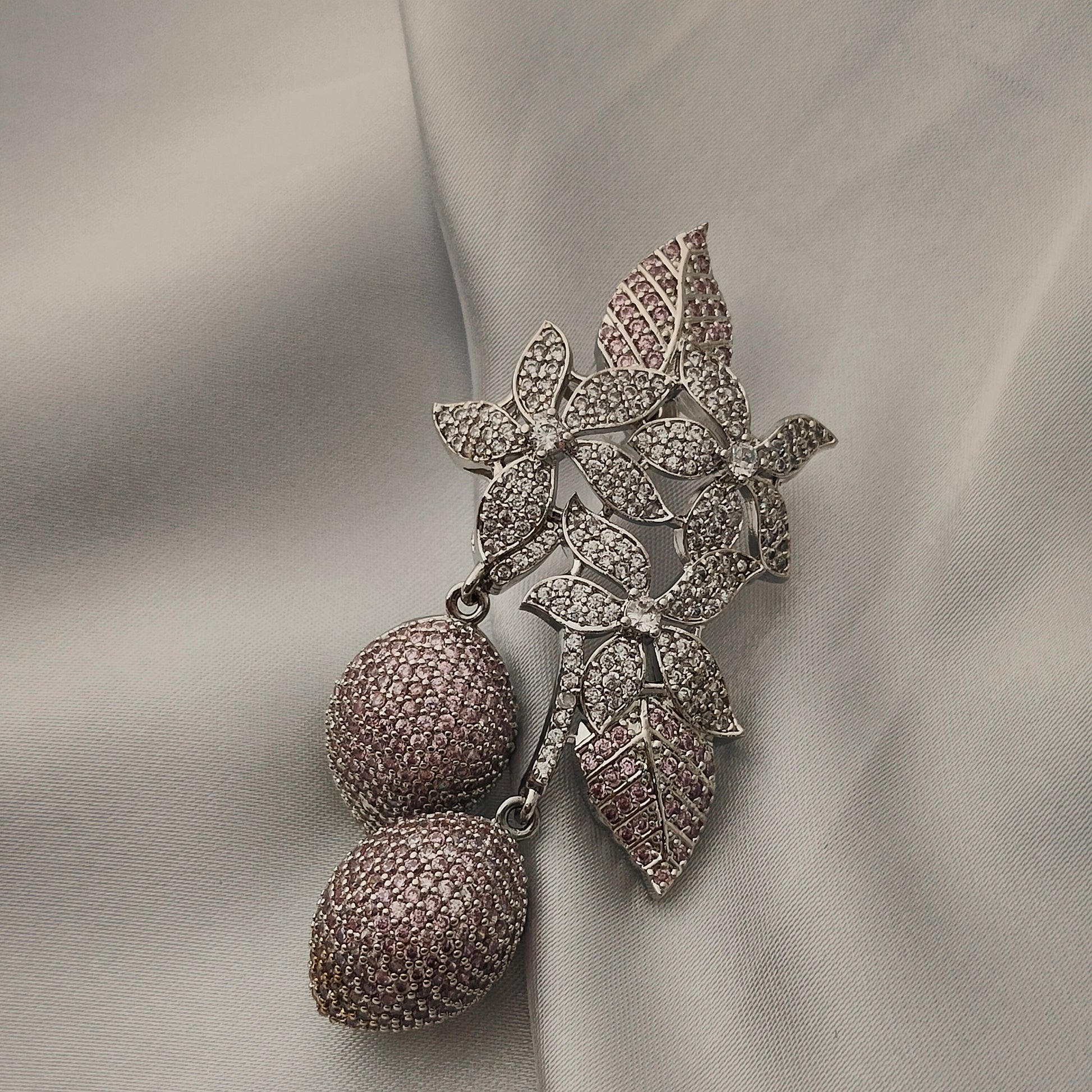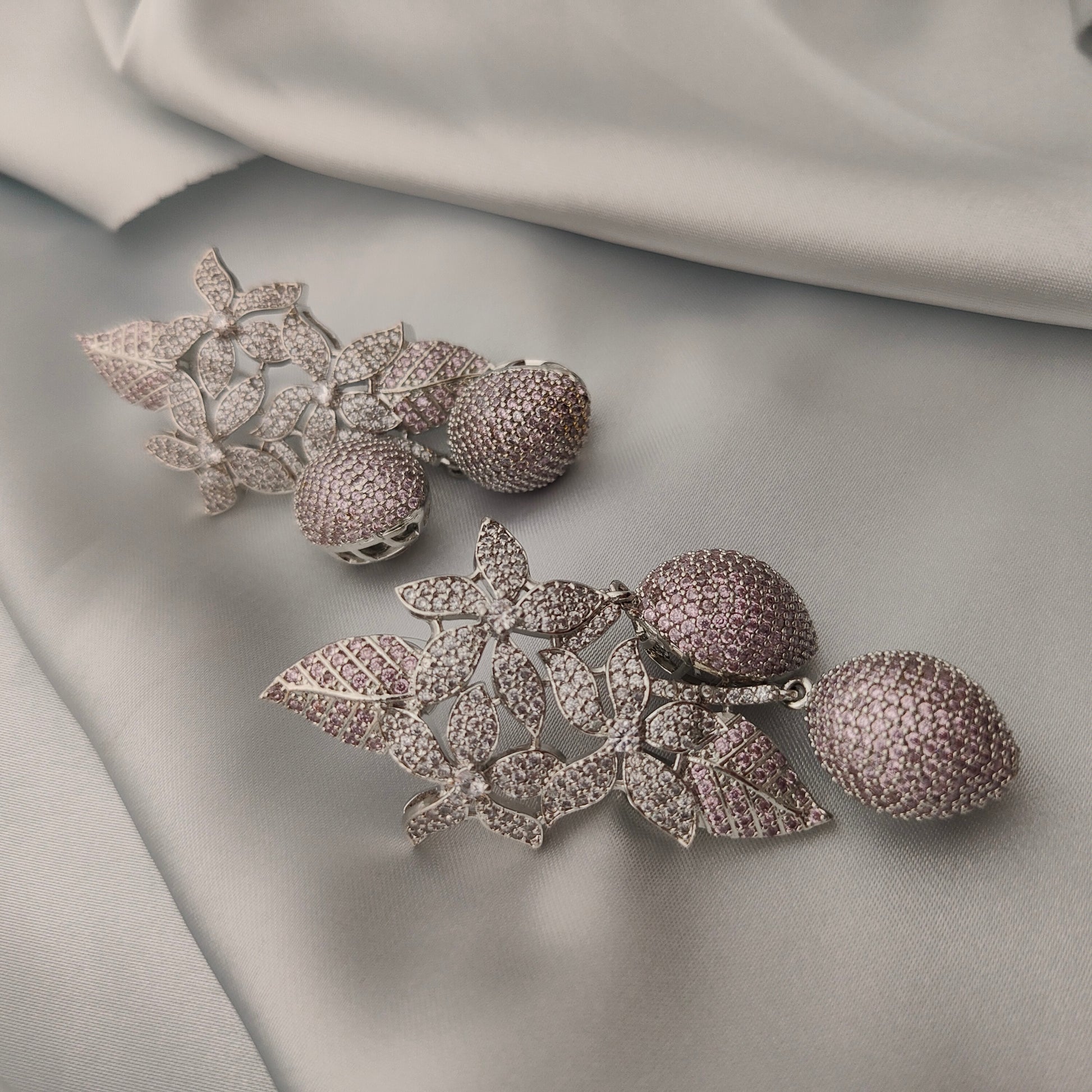 Inspired by the poetry of nature, Lilac Bloomdrops earrings are a luxurious cascade of crystal-encrusted florals and foliage, ending in two delicate lilac-toned berry drops. Each element is intricately crafted to evoke the wild beauty of a blossoming garden — dreamy, whimsical, and opulent. These earrings make a quiet yet unforgettable statement with their botanical grace and soft sparkle.