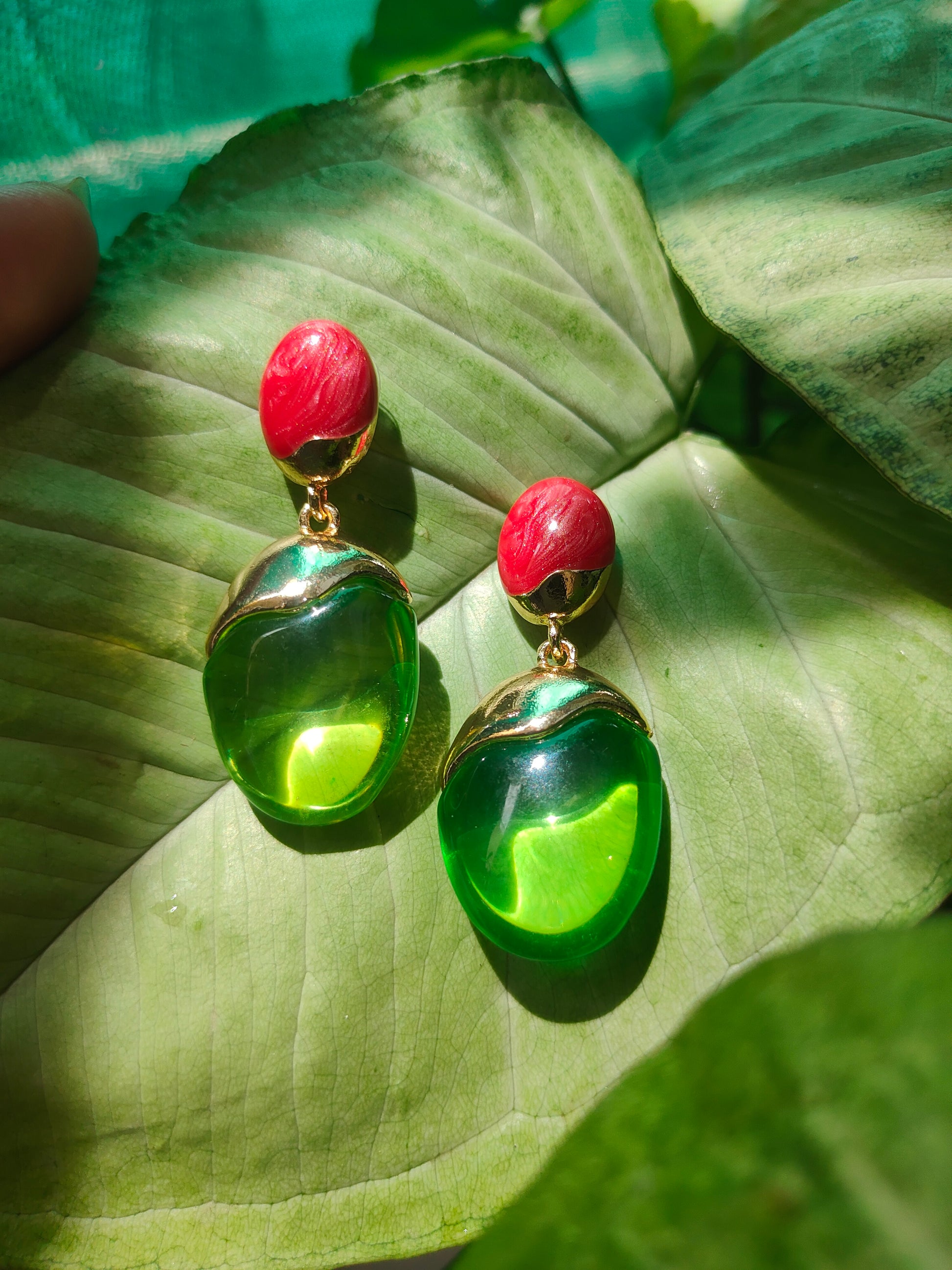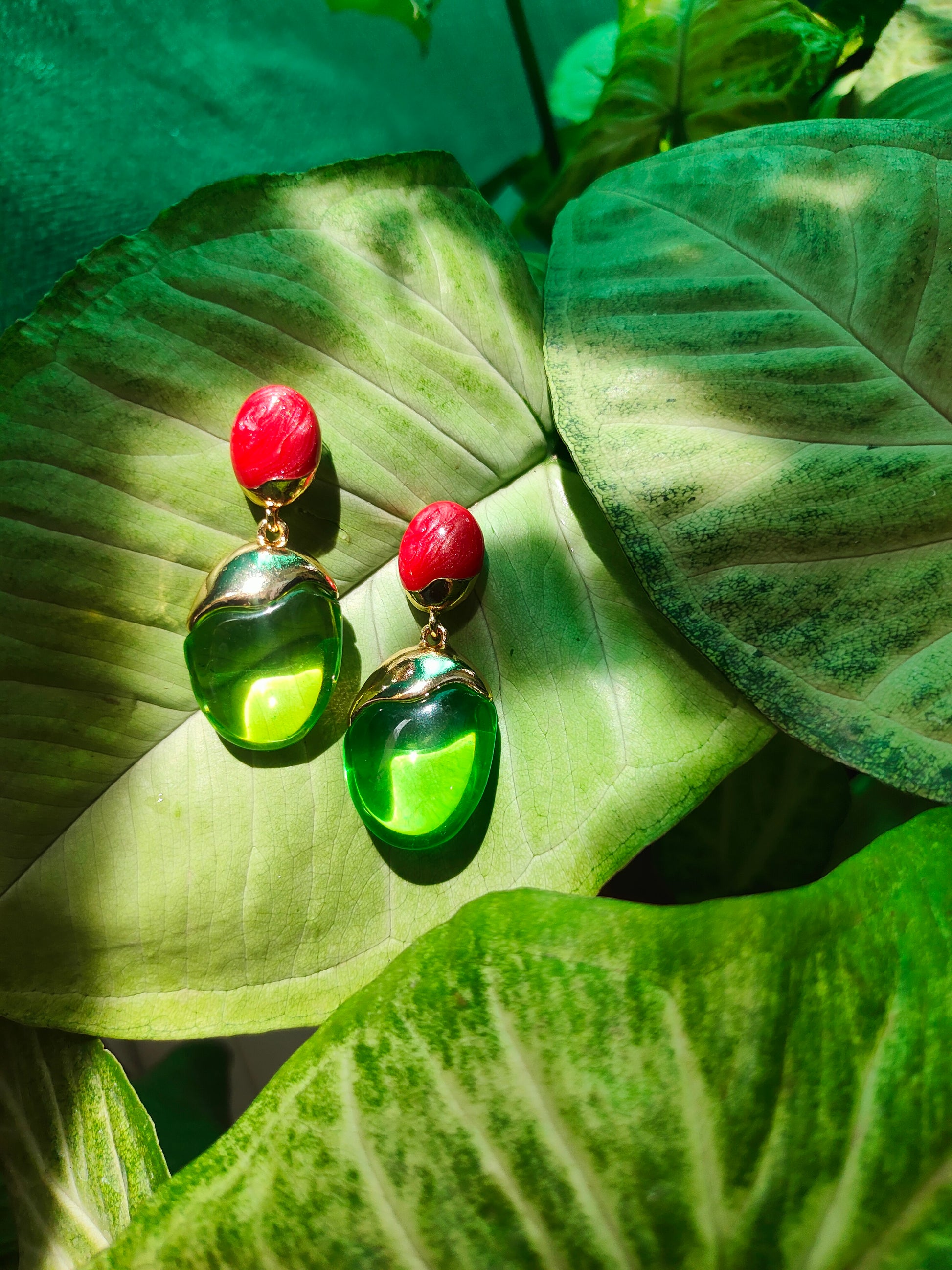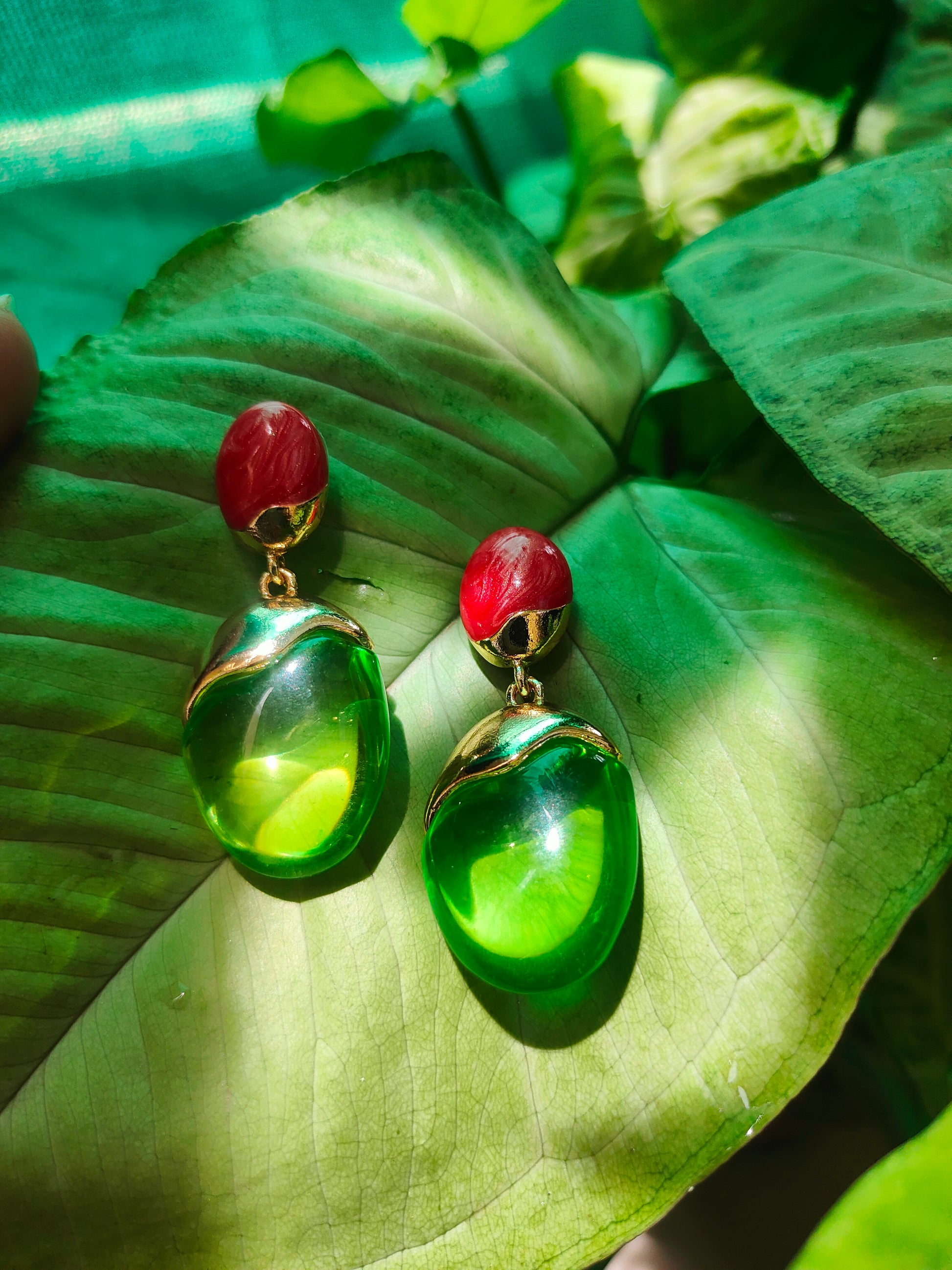 Fruity, fun, and full of personality — the Melon Drop Delights are your pop of summer in jewelry form. With a vibrant green jelly-drop base topped by a coral-pink enamel stud, this pair feels fresh off a tropical vacay. The asymmetrical curves and translucent finish give it a playful yet luxe feel — perfect for when you're ready to stand out.
