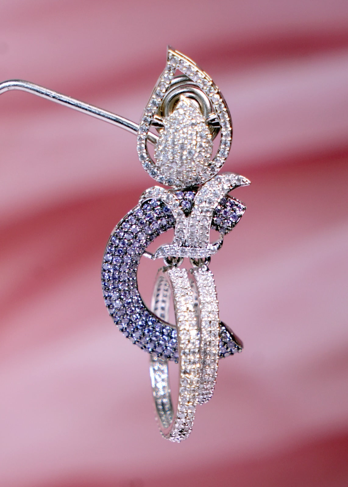 A dazzling interplay of geometry and grace, Noor-e-Amethyst earrings are a symbol of contemporary royalty. With an abstract flame-like top and interlocking rings below, these earrings feature rich violet-hued crystals set against a bed of shimmering white stones. The dynamic structure and regal color palette make them a perfect blend of bold design and timeless sparkle.