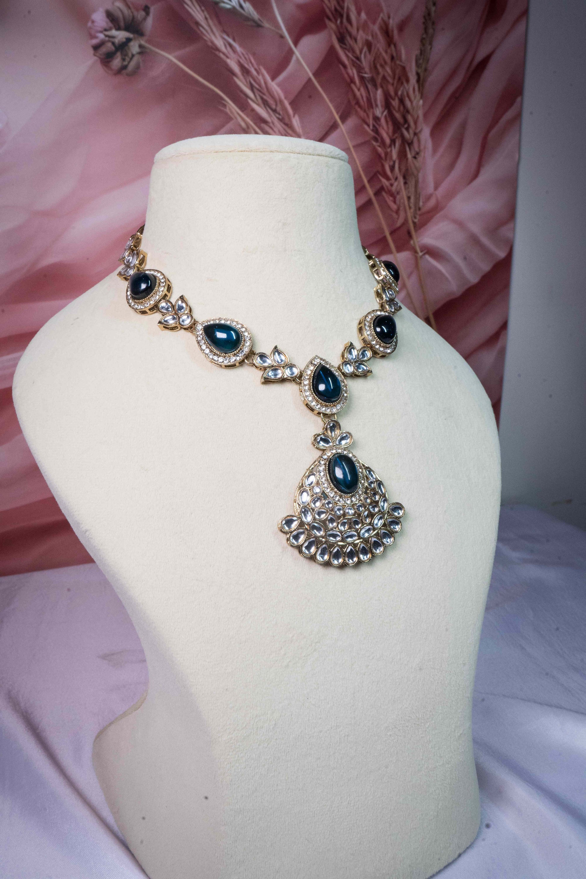 A symphony of grace and glamour —The Royal Teal Set features soft blush stones framed in delicate kundan work. Perfect for those who love understated elegance with a royal touch. Pair it with pastel sarees or fusion fits for a dreamy festive glow.
