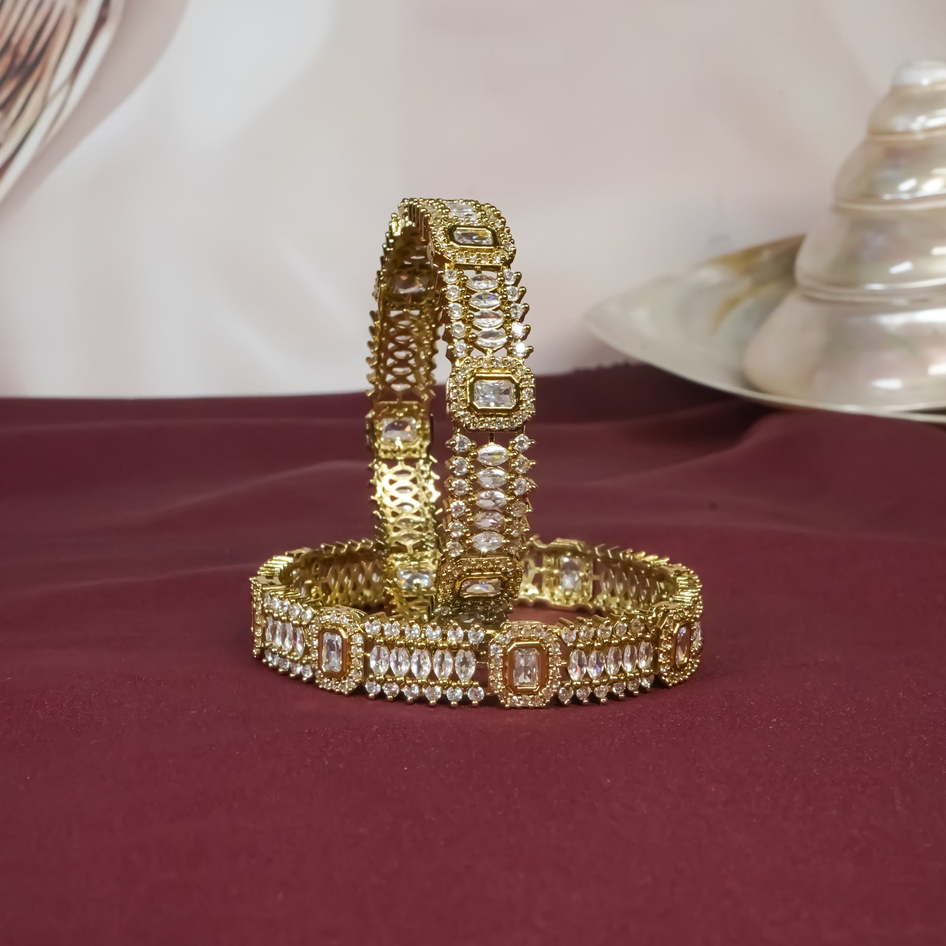 Radiating regal charm, the Queensa Gleam Bangles feature intricate gold-tone detailing embellished with mini glass stones and AD accents. Their symmetrical design and rich sparkle make them a timeless addition to your festive and wedding jewelry collection.