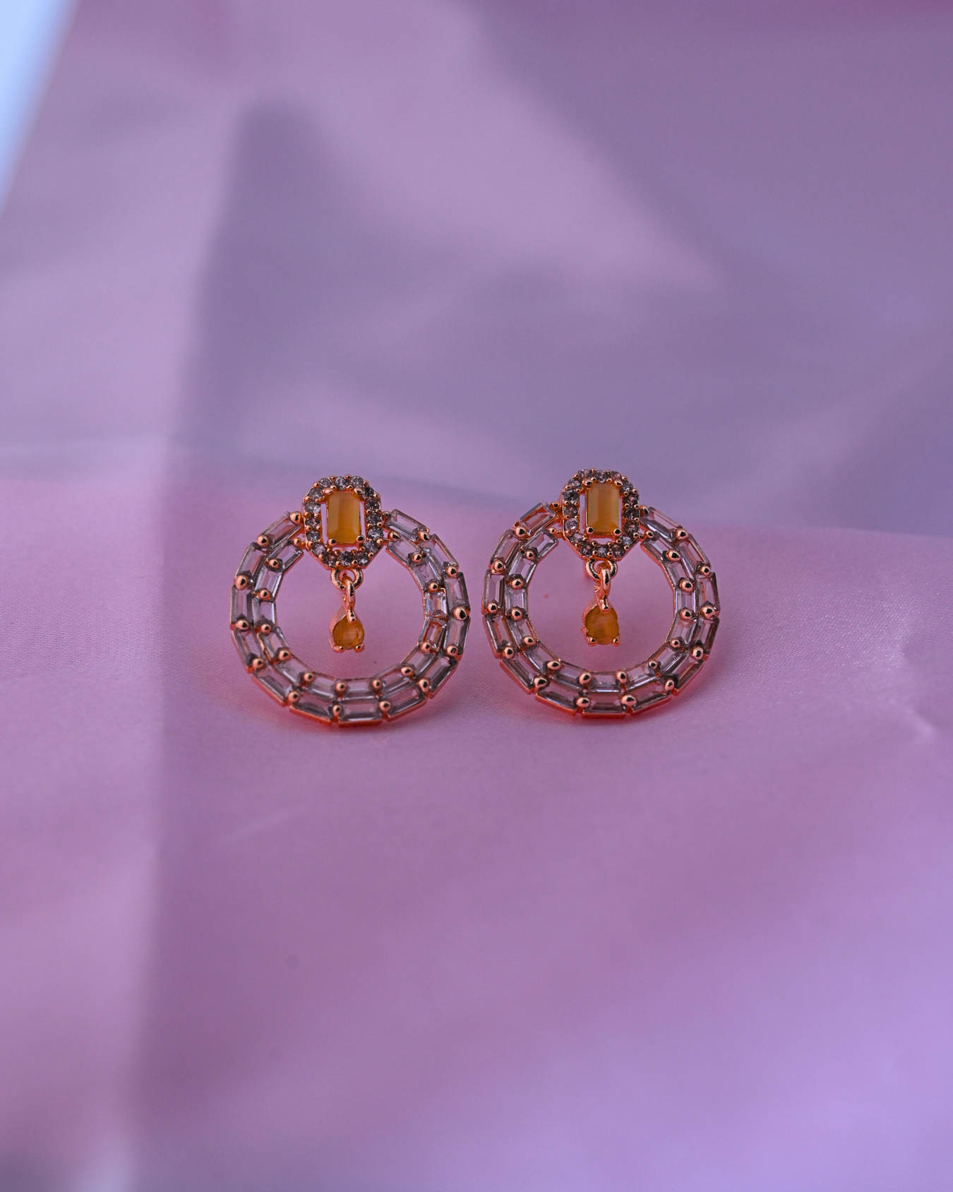 Shine with elegance and sophistication with these beautifully crafted circle drop earrings. Designed in a rose-gold finish, adorned with baguette-cut stones and a delicate dangling gem, these earrings are perfect to add charm to any outfit.Â