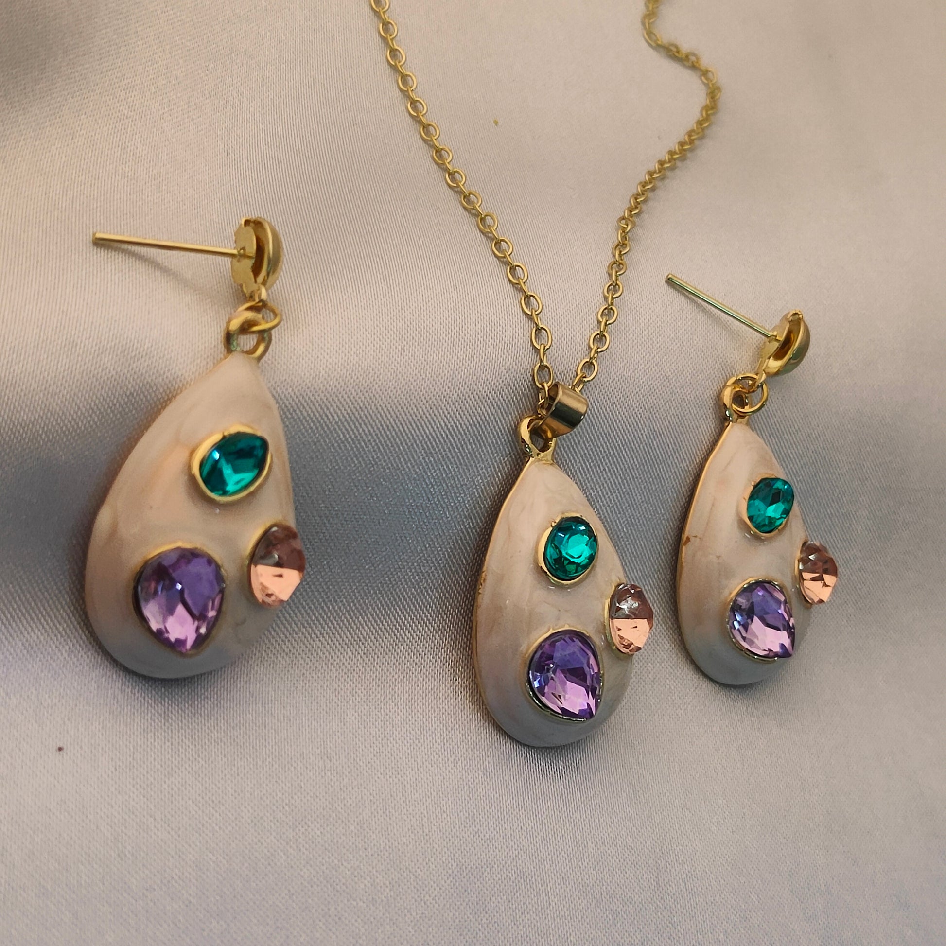 Raindrop Reverie is a whimsical jewelry set that captures the playful elegance of rain-kissed colors. The pendant and matching earrings are crafted in soft teardrop-shaped ceramic with a marbled finish, set with sparkling gem-like stones in jewel tonesโ€”emerald green, amethyst purple, and rose quartz pink. The gold-toned setting adds a regal warmth, creating a look thatโ€™s both artsy and elevated.