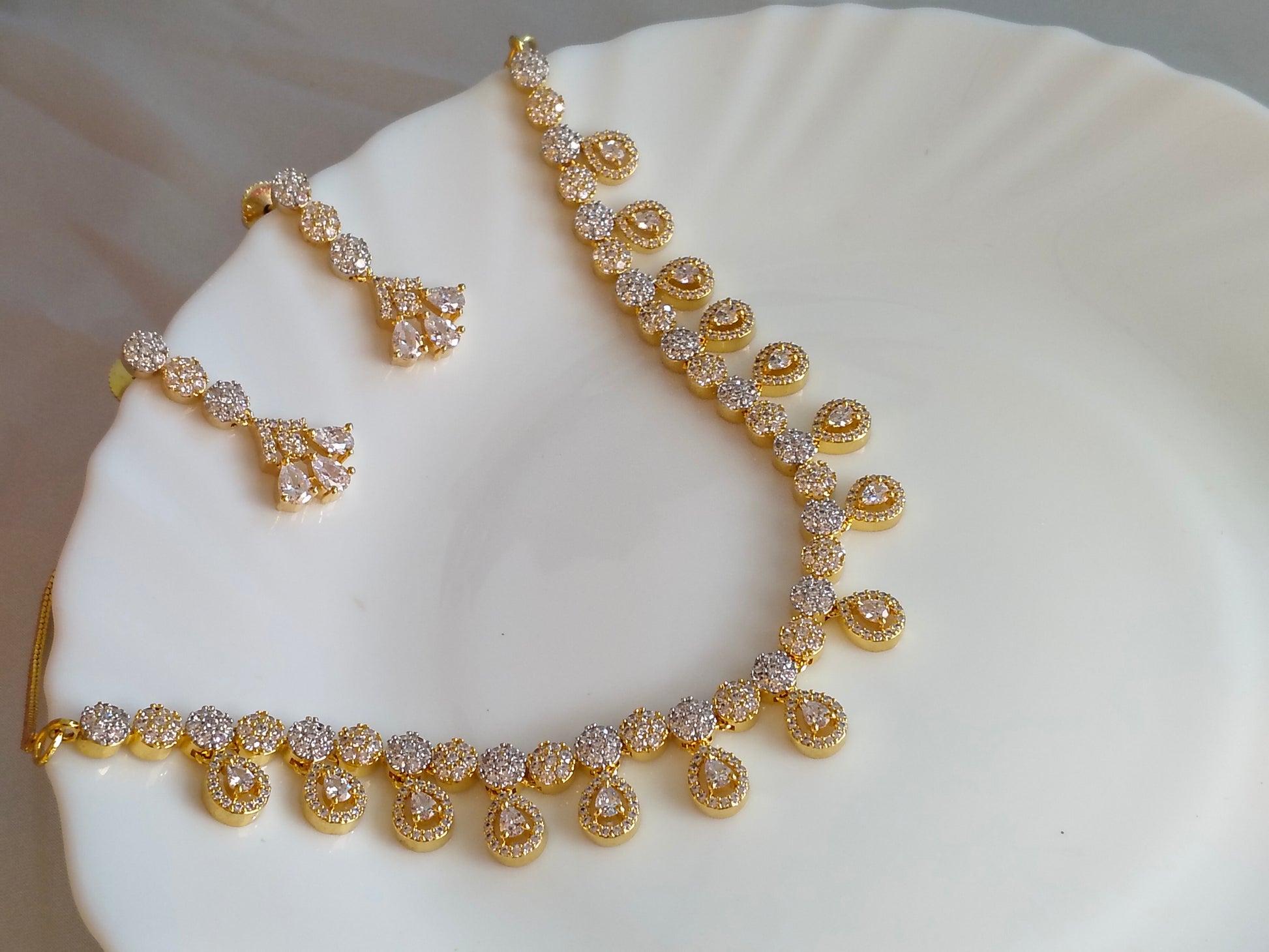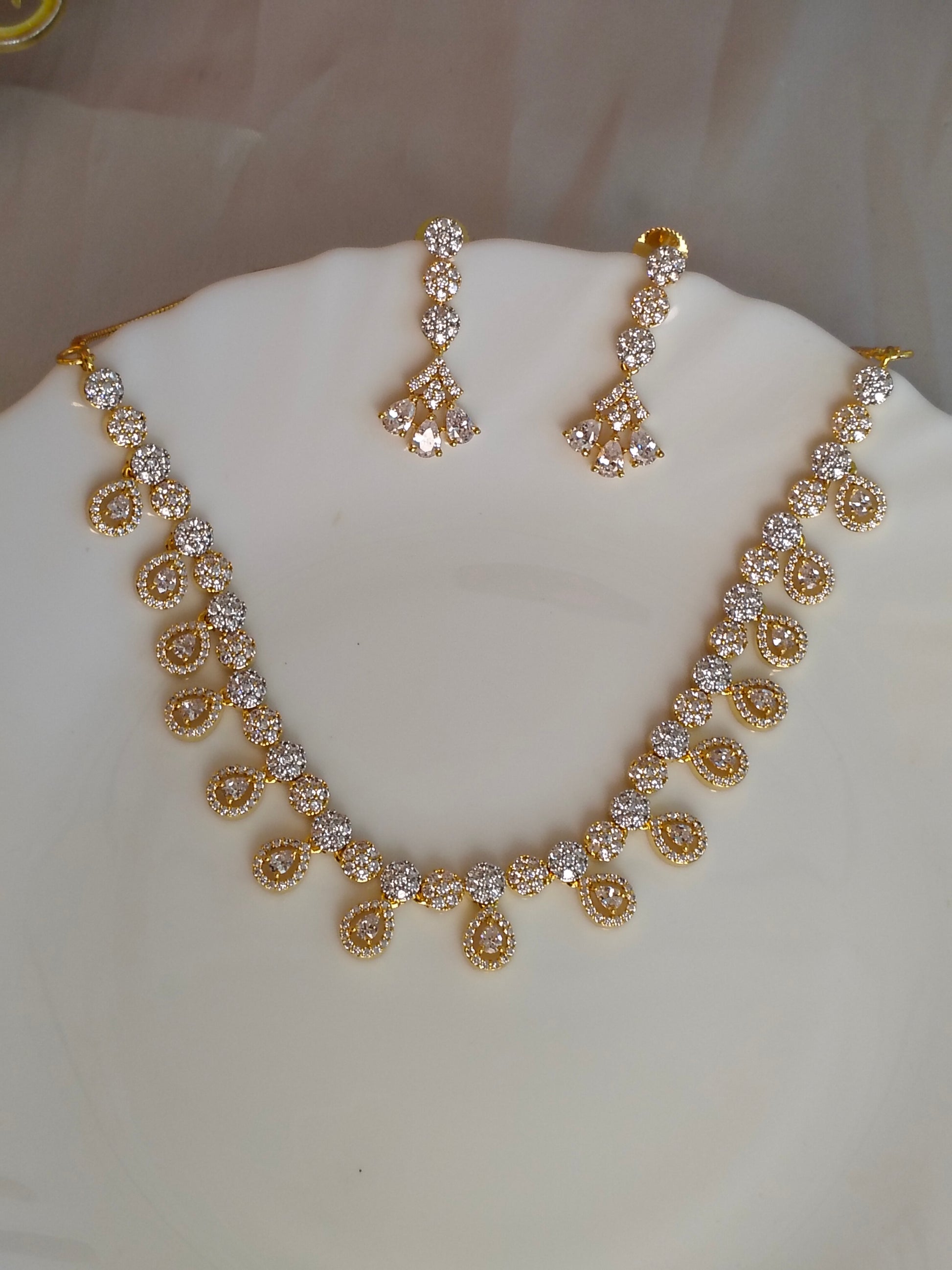 An elegant necklace set crafted with shimmering white stones and deep ruby-red drops, paired with matching earrings. The combination of sparkling brilliance with bold red hues gives it a timeless and regal appeal, perfect for festive and traditional occasions.