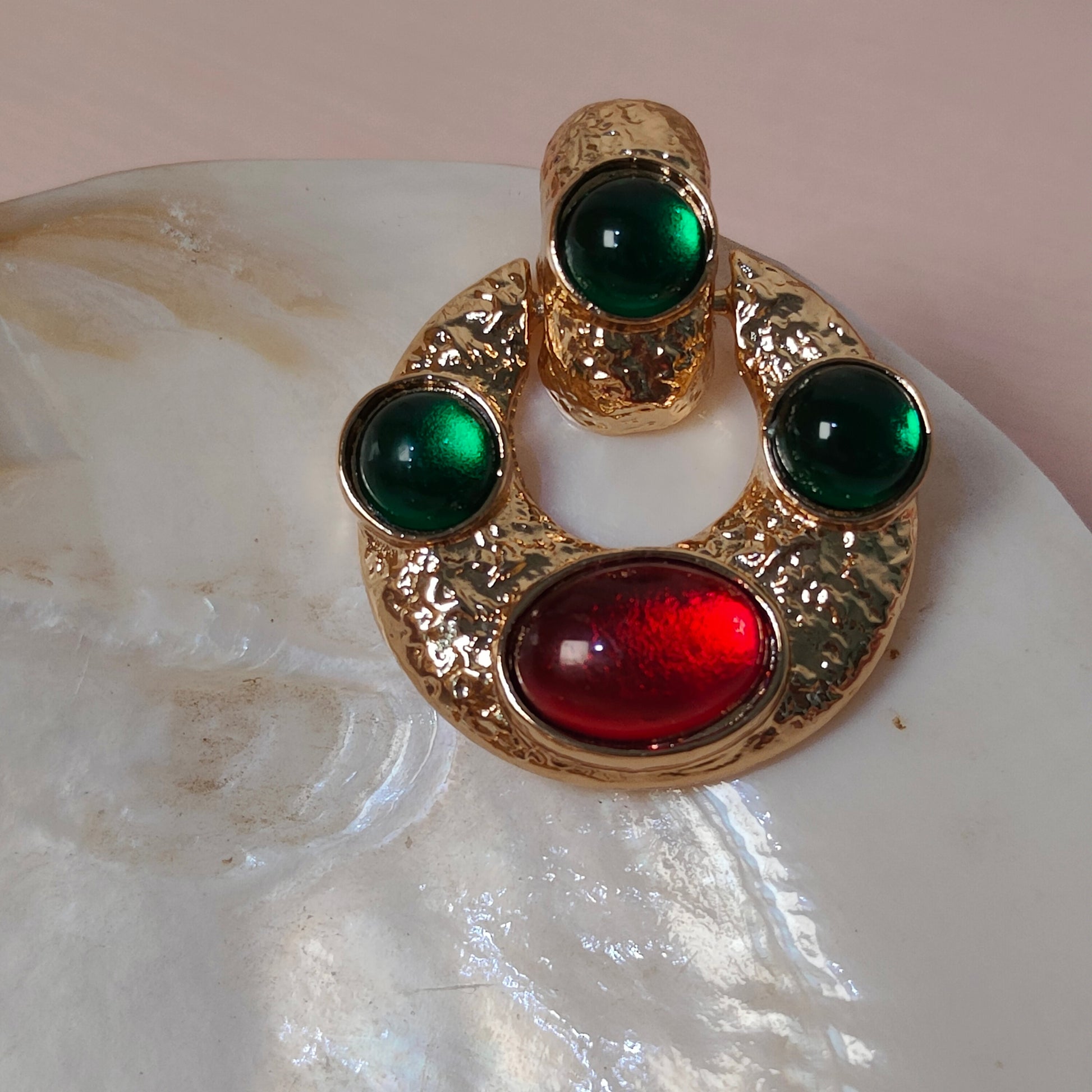 Vintage charm meets cosmic elegance in the Regal Orbit Hoops. These earrings feature a textured, hammered gold-tone crescent design adorned with deep emerald green and rich ruby red cabochon stones. Bold yet balanced, they bring a royal edge to both contemporary and classic looks.