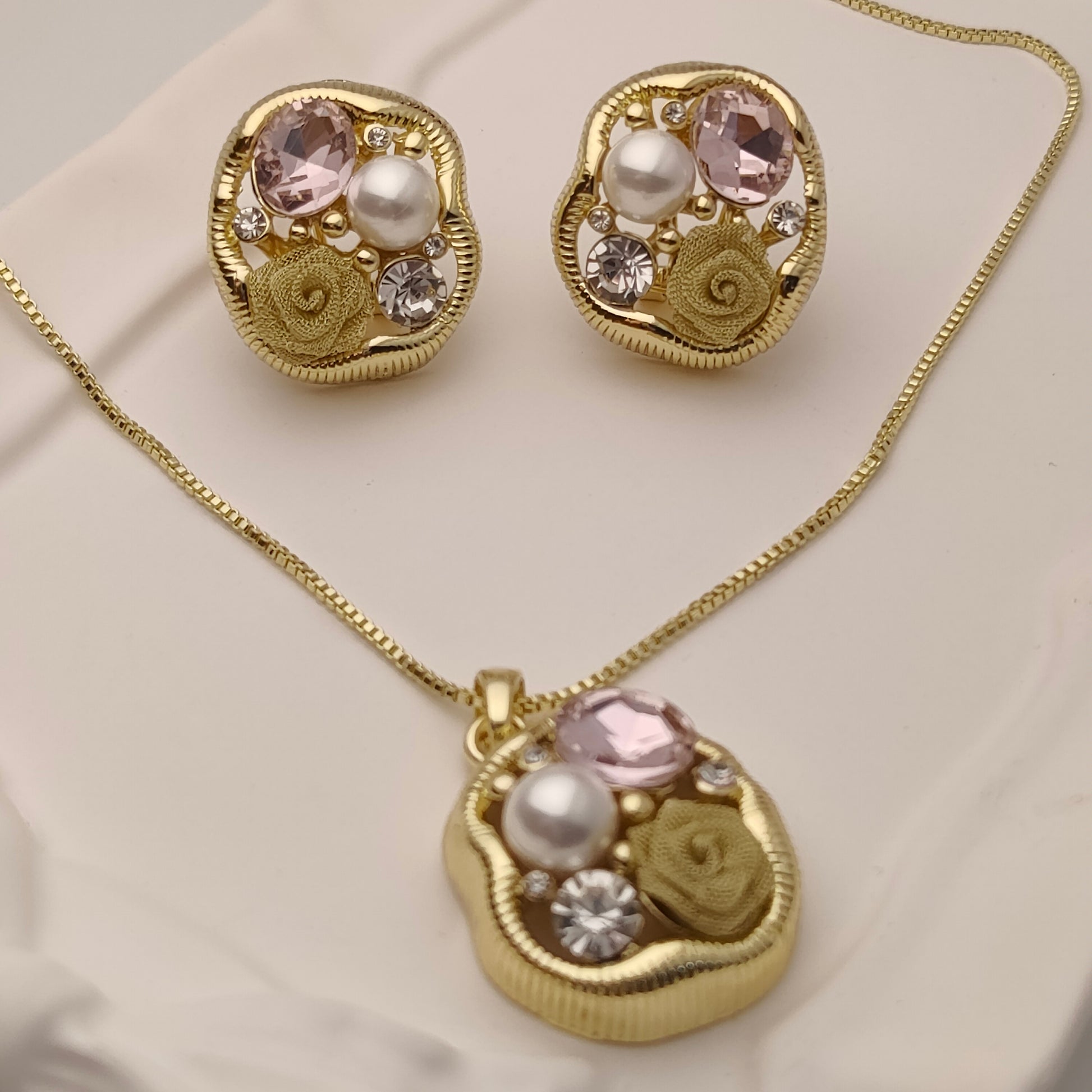 The Rosabelle Bloom Set is a whimsical harmony of femininity and grace. Designed with delicate blush pink stones, pearly accents, and intricate golden fabric roses, this set brings a garden-inspired fantasy to life. The gold-tone sculpted frame adds a vintage charm, while the mix of textures offers a rich, handcrafted look.