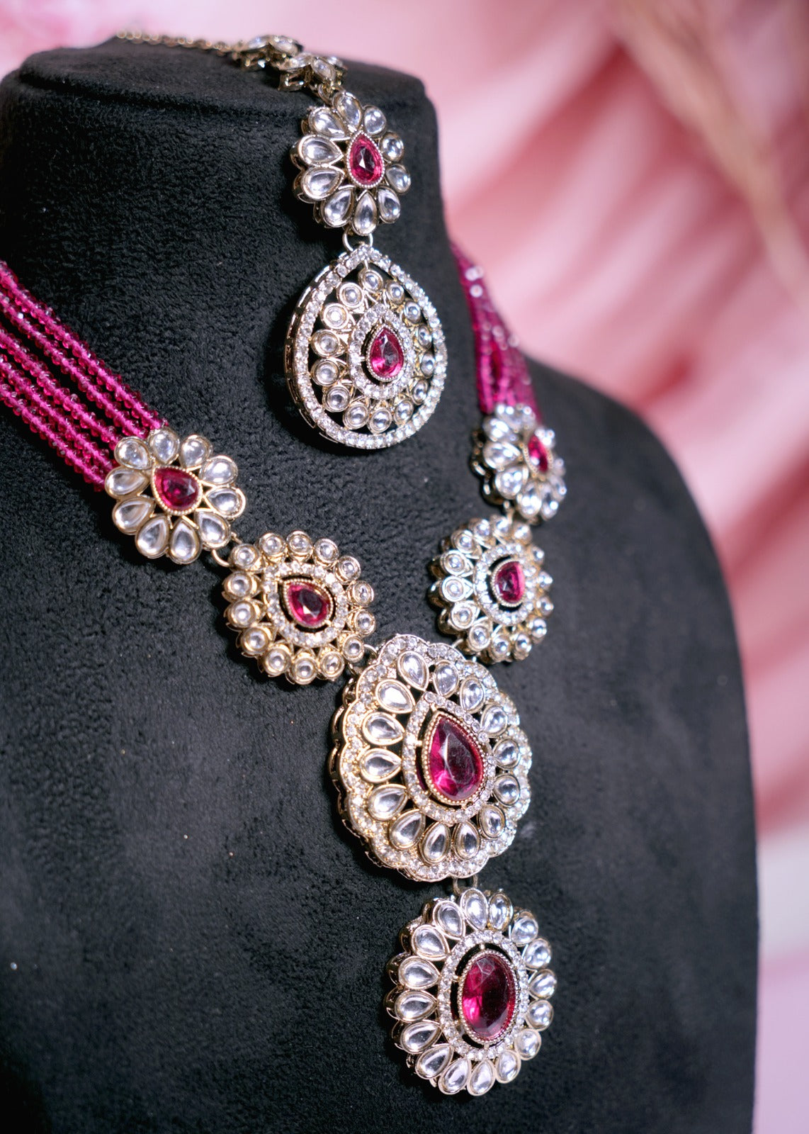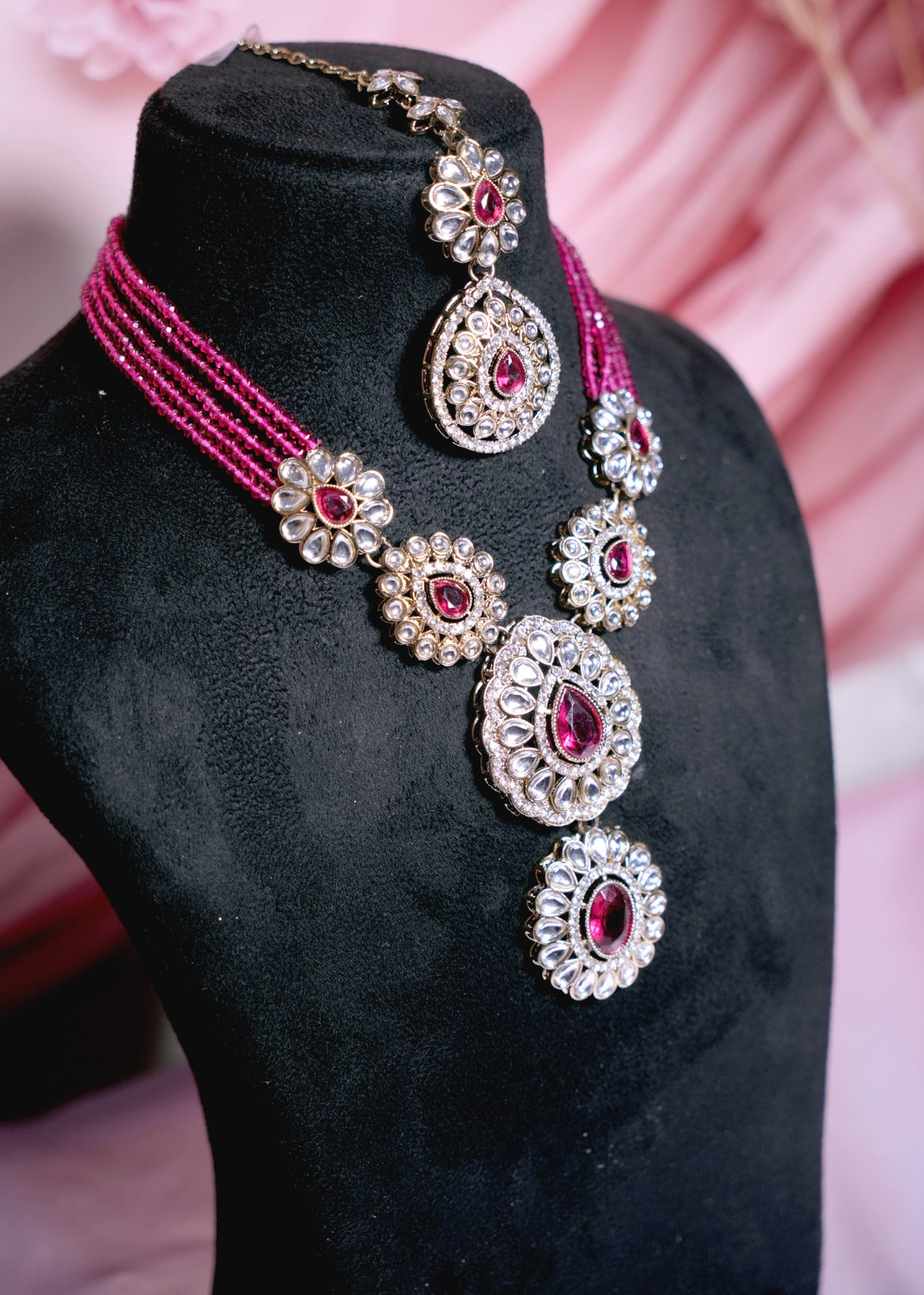 Delicate yet regal, this pink kundan double pendant set is designed with two intricately crafted kundan pendants, each accented with a subtle pink stone. Strung on a pink bead mala, the set radiates charm and sophistication. The slightly smaller pink stone gives it a softer, more elegant appeal, making it ideal for festive wear, weddings, or even contemporary Indo-western looks.
