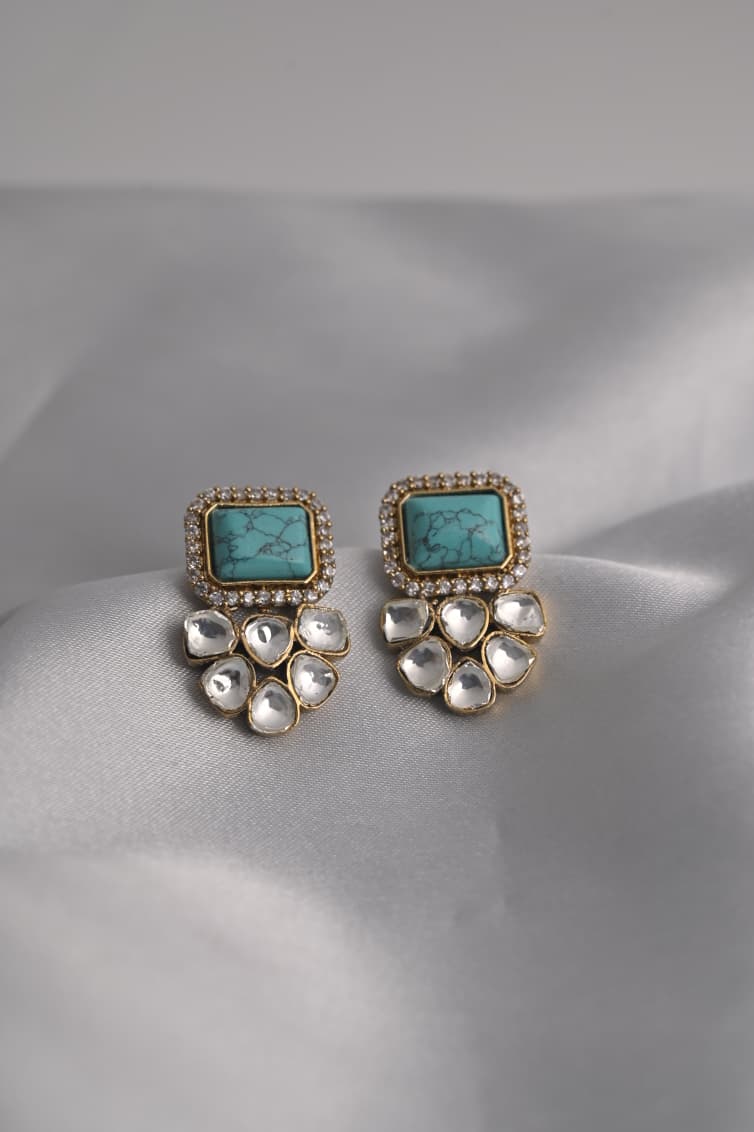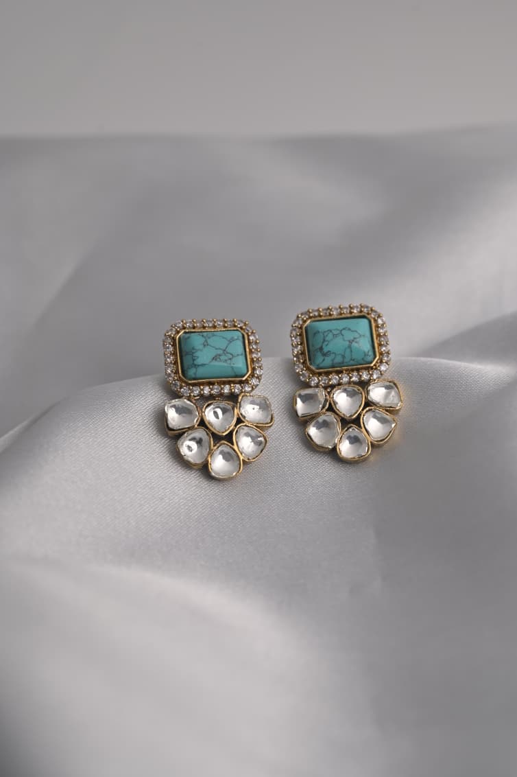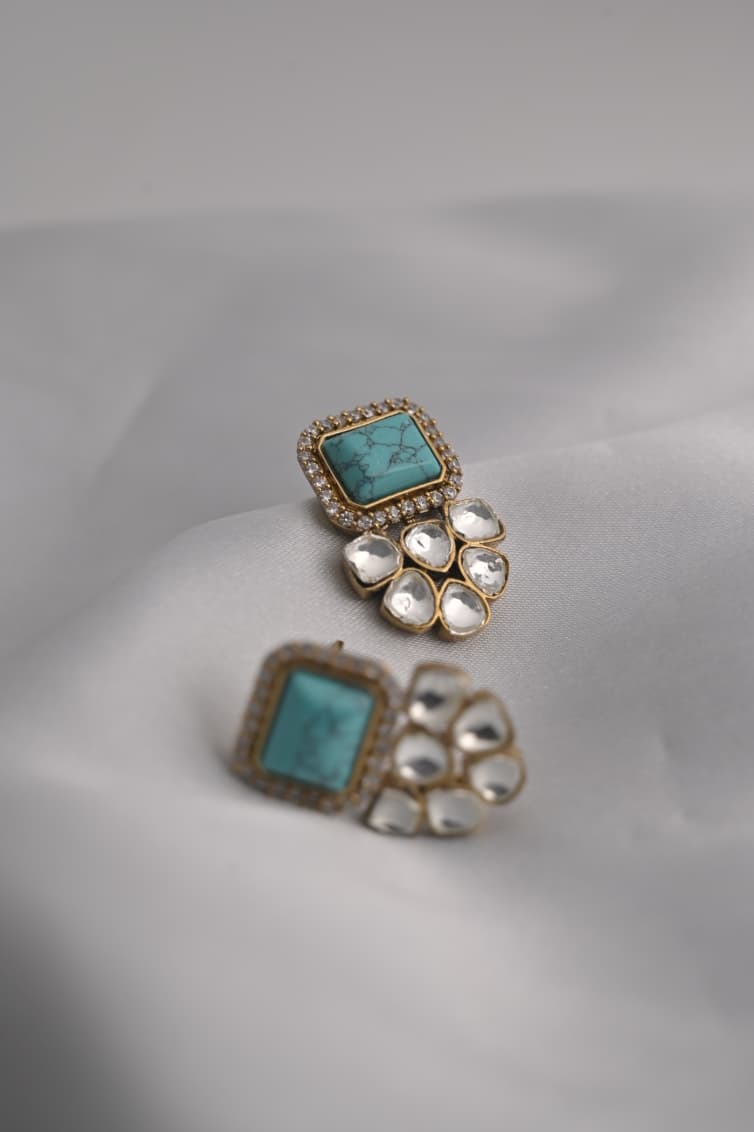 Dive into timeless elegance with our Sapphire Petals Studs- where heritage meets modern charm. The striking turquoise centrepiece framed with delicate crystals pairs beautifully with the cluster of polki- inspired petals, creating a fresh bloom of radiance. Perfect to style with both ethnic drapes and contemporary fits, these Studs add a statement pop of colour while keeping the grace of tradition alive.