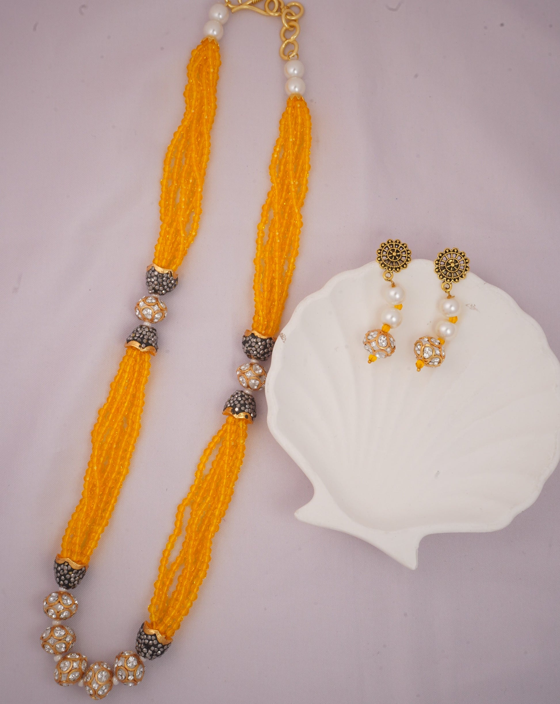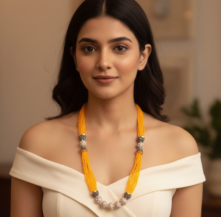 Bright, festive, and full of warmth — this kesariya-hued mala is crafted to light up your look instantly. The rich yellow beads are beautifully complemented by sparkling AD-studded accents, creating a perfect balance of tradition and shine. Lightweight yet striking, this mala is designed for celebrations where you want colour, glow, and elegance in one statement piece.