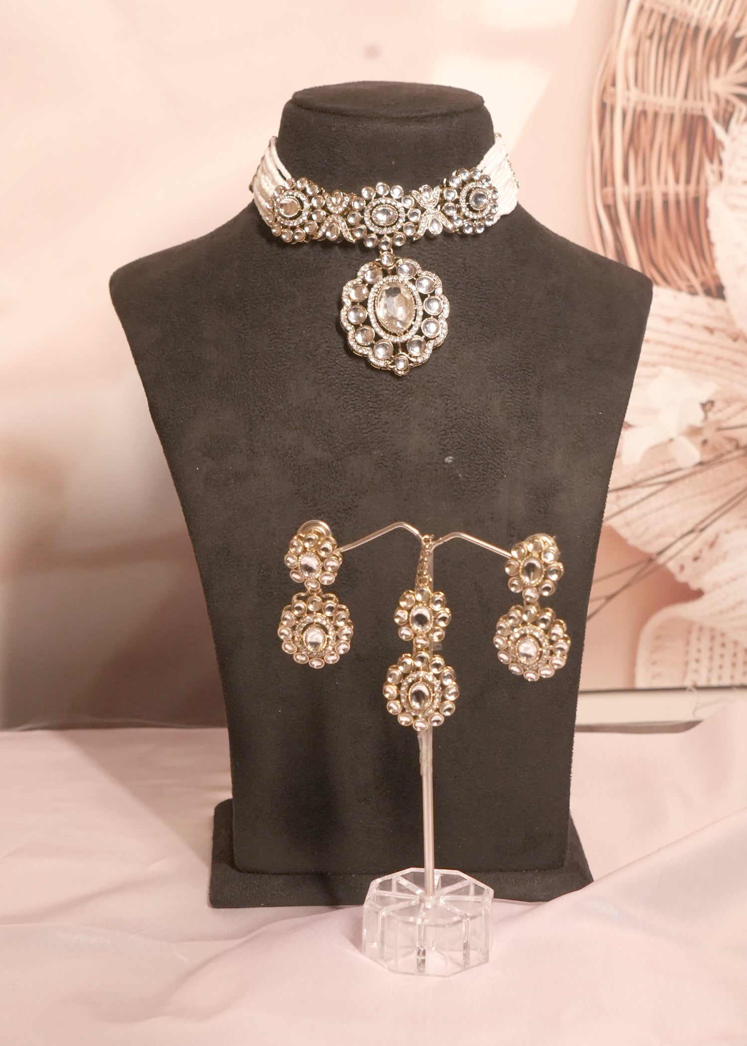 Elevate your ethnic look with this exquisite green kundan set. Featuring intricately set silver stones outlined with sparkling kundan, this set exudes elegance and traditional charm. Perfect for weddings, festive occasions, or any moment you want to shine.