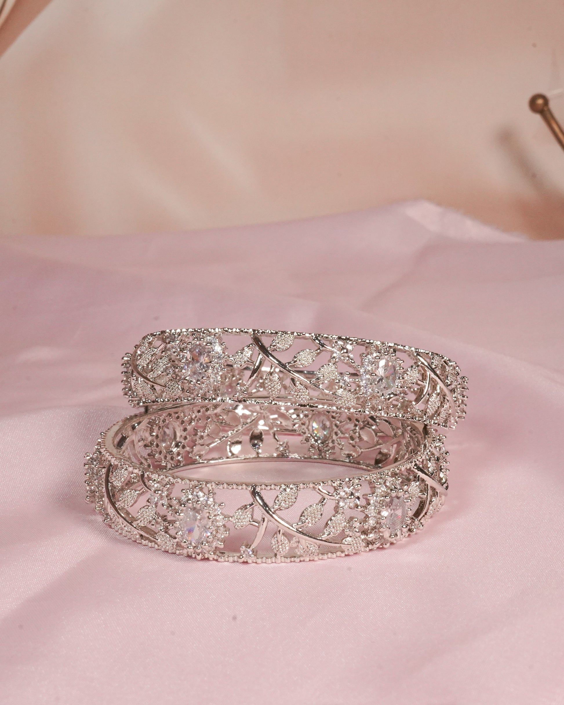 Delicate artistry meets modern shimmer in this Silver Nano AD Bangle. Intricately designed with tiny leaf and flower motifs along the inner band, it radiates a soft feminine charm. The fine nano AD stones add a subtle sparkle, making it a perfect blend of grace and everyday elegance. Whether worn solo or paired with other bangles, this piece beautifully enhances any look with its refined silver glow.