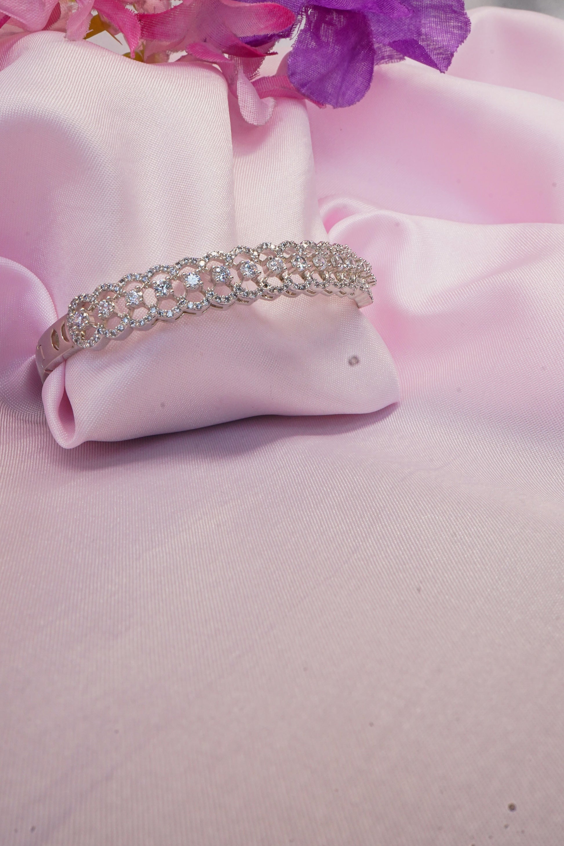Dainty yet dazzling — the Celestine Crystal Loop Bracelet is crafted with interlinked circles of shimmering stones, symbolizing eternal elegance. Its intricate lattice design adds a refined sparkle, making it a timeless addition to your jewellery collection. Lightweight, anti-tarnish, and comfortable for long wear, this bracelet effortlessly transitions from day charm to evening glamour.