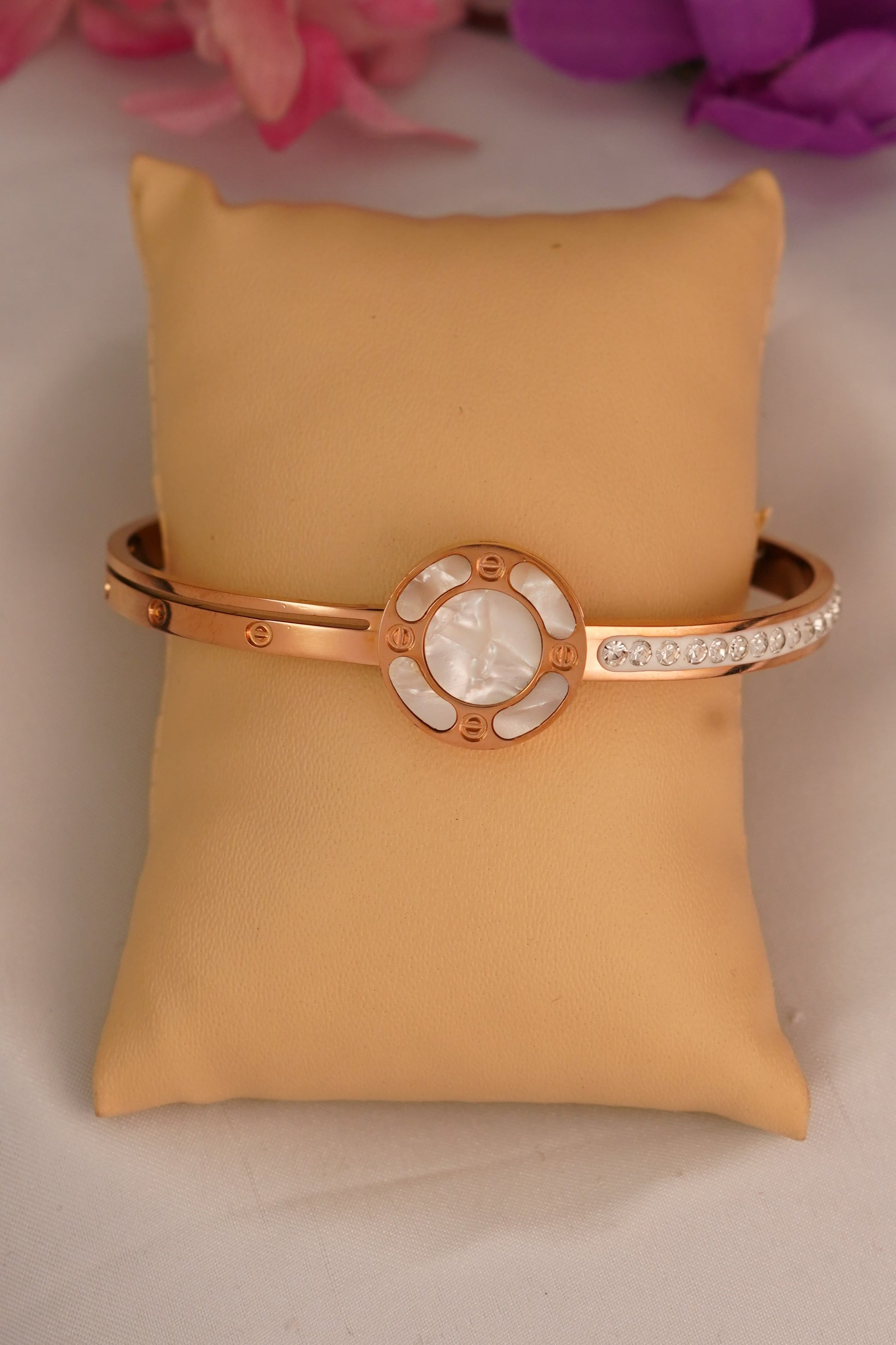 Add a touch of soft elegance with our Symphony Bracelet, featuring a stunning circular hoop at the centre filled with smooth white enamel. The outer curve of the wrist is beautifully lined with tiny sparkling stones, creating a subtle contrast between matte enamel and shimmering shine. Perfectly balanced, minimalistic, and modern—this bracelet is designed to elevate any look with gentle sophistication.