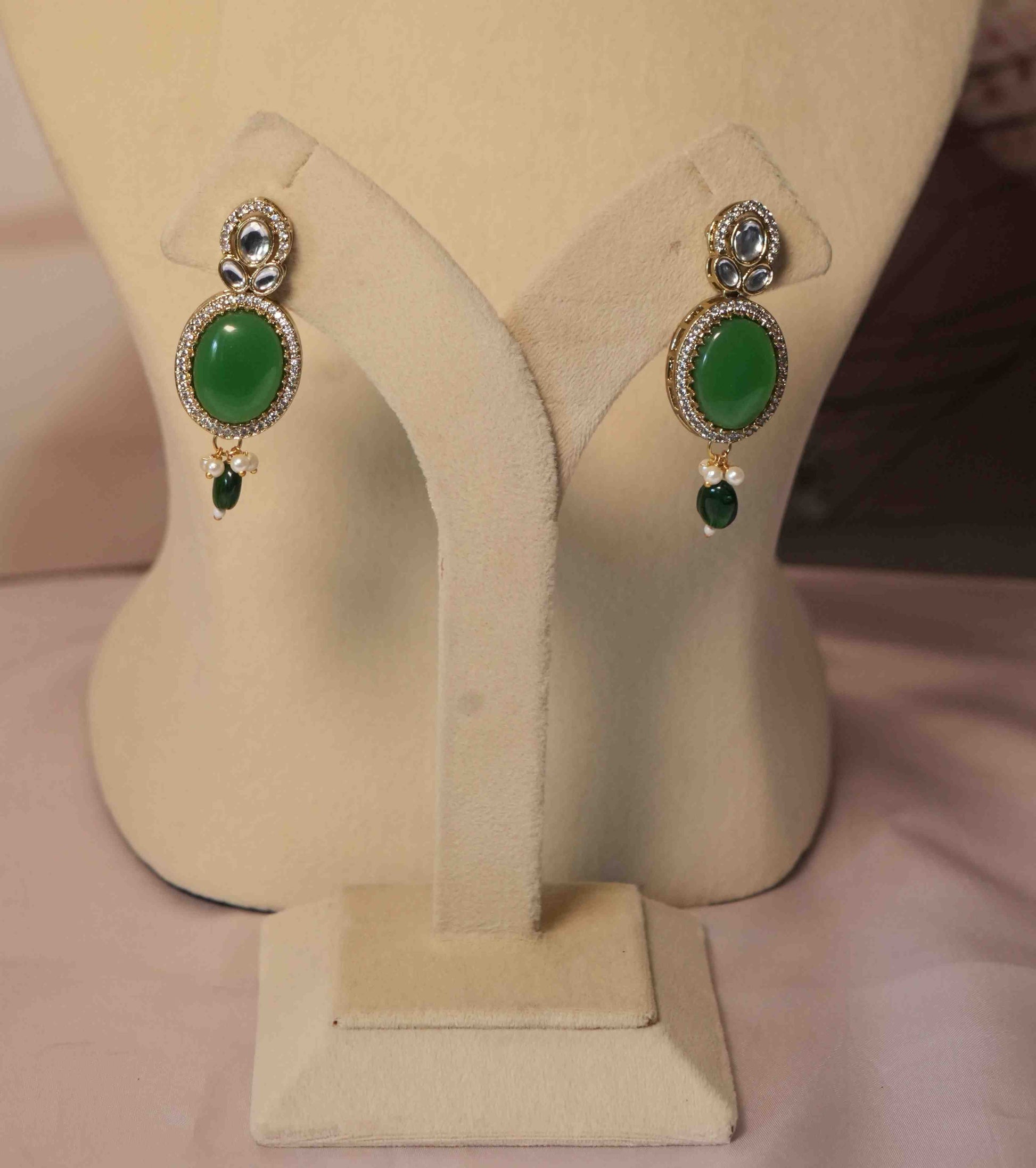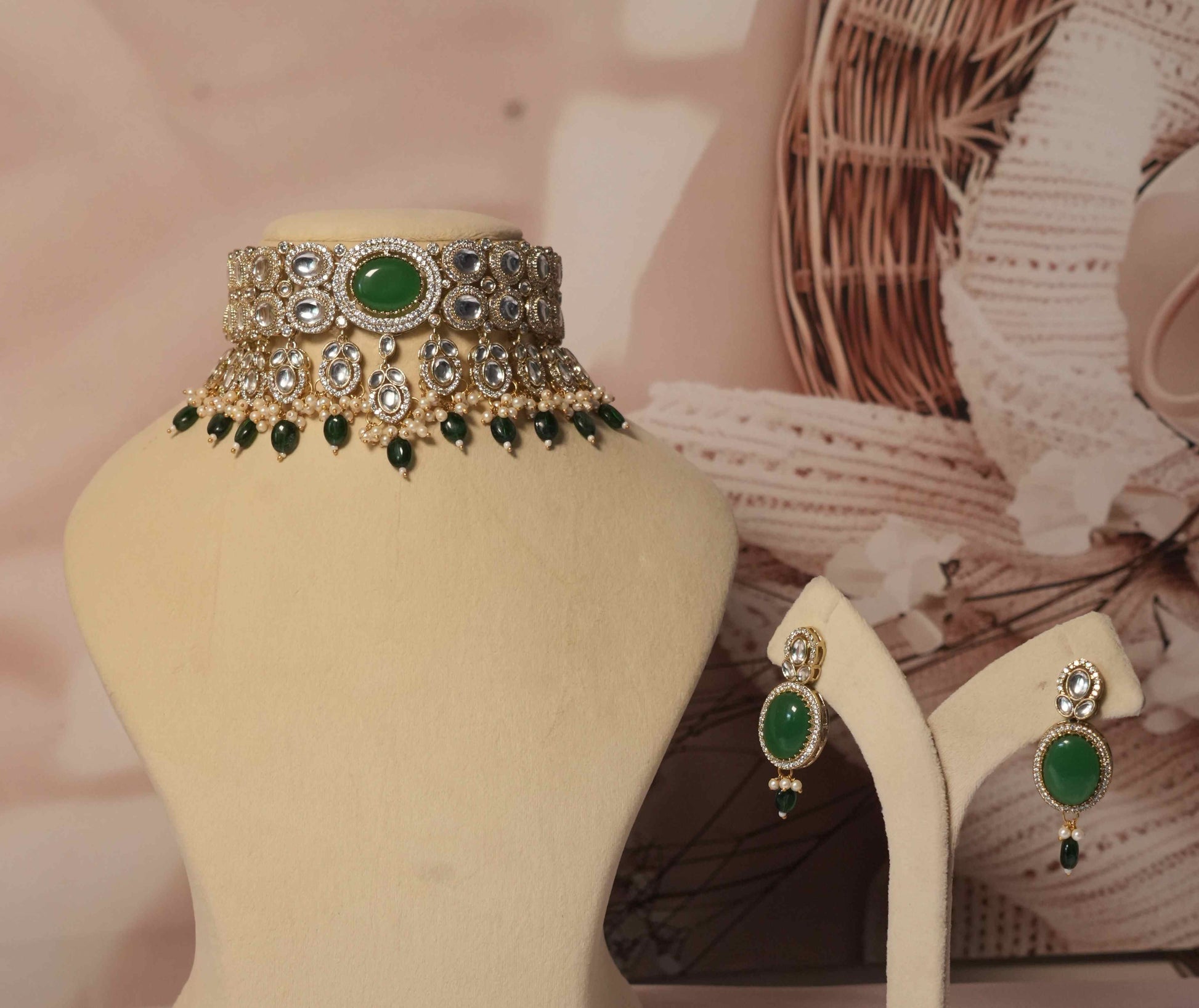 The Queen's Charm Choker set is an opulent statement piece that exudes timeless grandeur. Crafted with precisions, this gold-tone choker is adorned with dazzling white stones and finished with striking green gemstones that bring a regal aura. Paired with matching drop earrings, set blends heritage charm with modern finesse, making it ideal for weddings, festive occasions or upscale soirees.