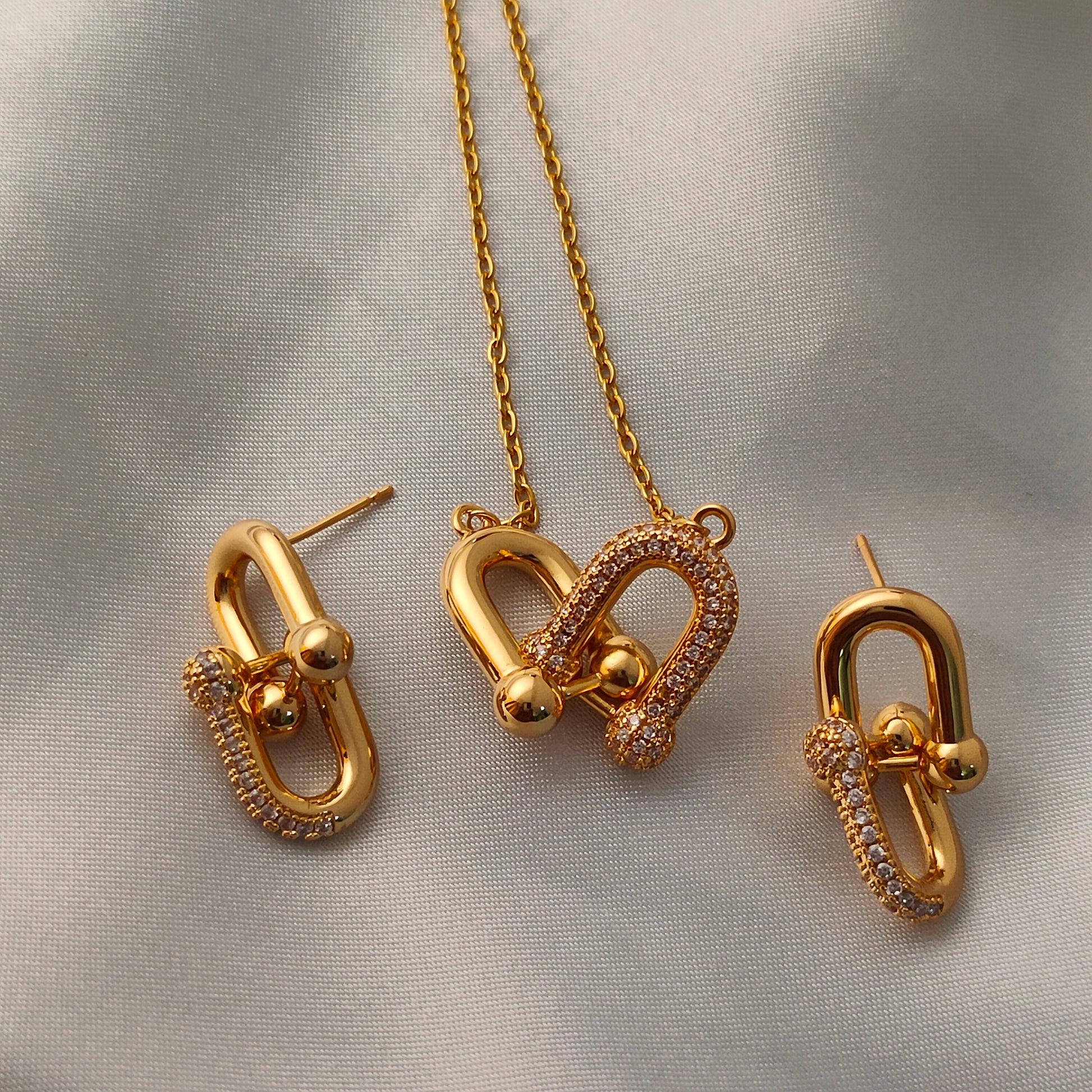 The Ziva Bolt Set is where edgy meets elegant. Inspired by industrial-style fastenings with a luxe twist, this gold-toned pendant and earrings feature a bold U-lock silhouette, softened by a line of shimmering stones. The design is fresh, unique, and perfect for those who love contemporary statement jewelry with a touch of glam.